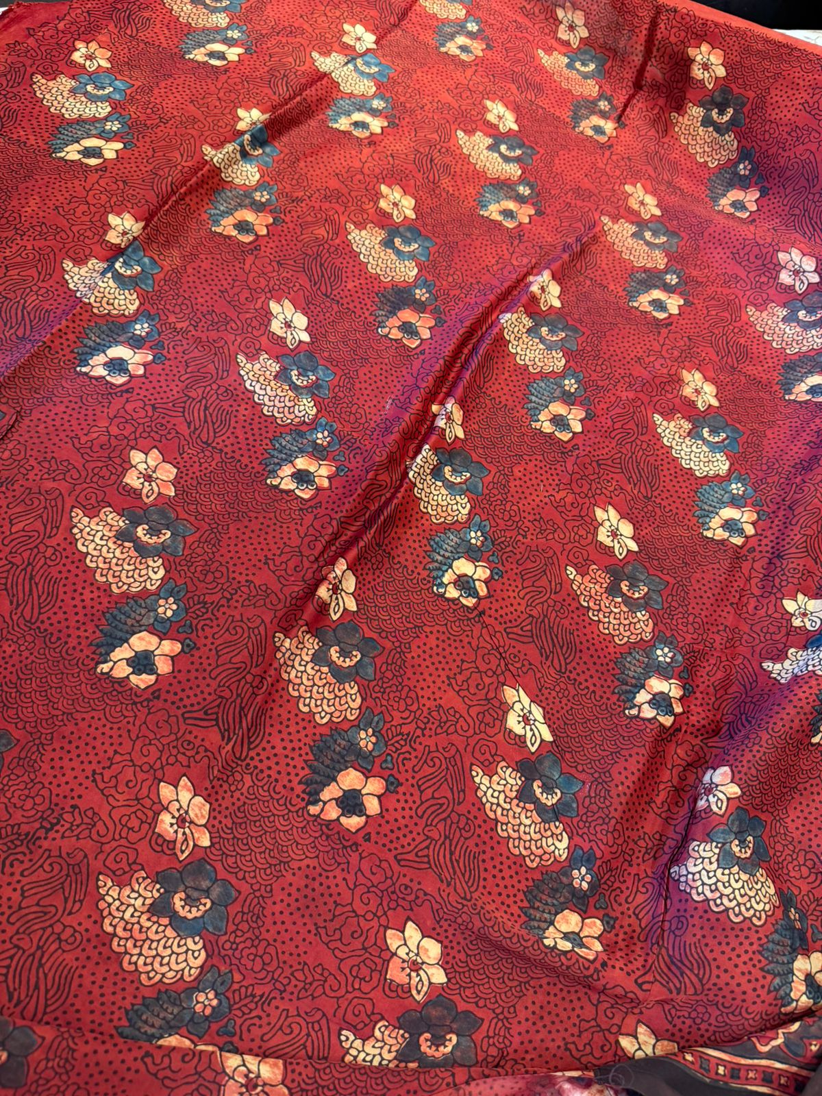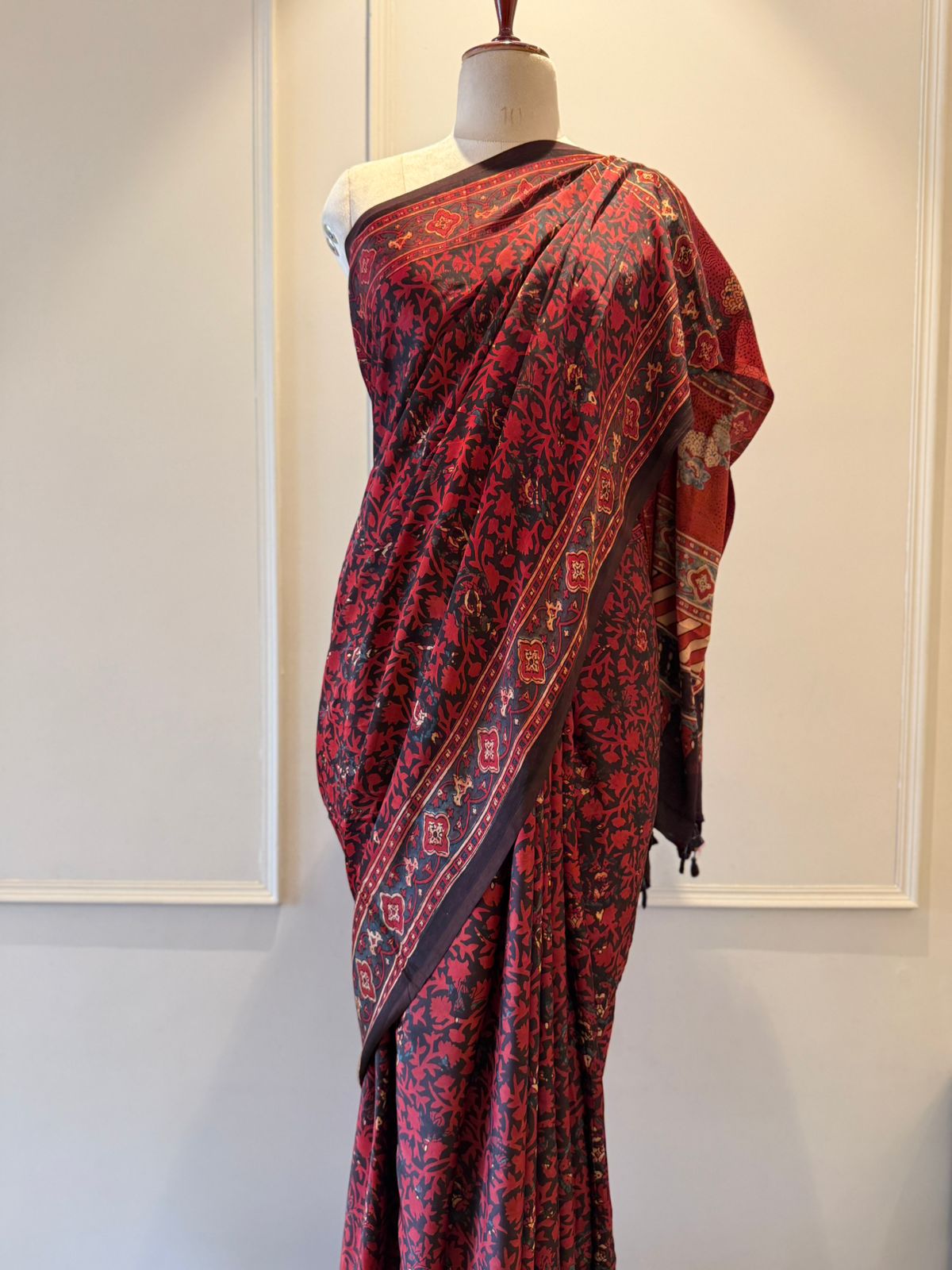 The rich maroon hue creates a regal and sophisticated base, enhanced with intricate Ajrakh prints featuring classic geometric and heritage-inspired motifs. Created using age-old hand block techniques, the detailed patterns reflect fine artisanal precision and cultural richness. A neatly defined border and an elegantly designed pallu complete this graceful ensemble.