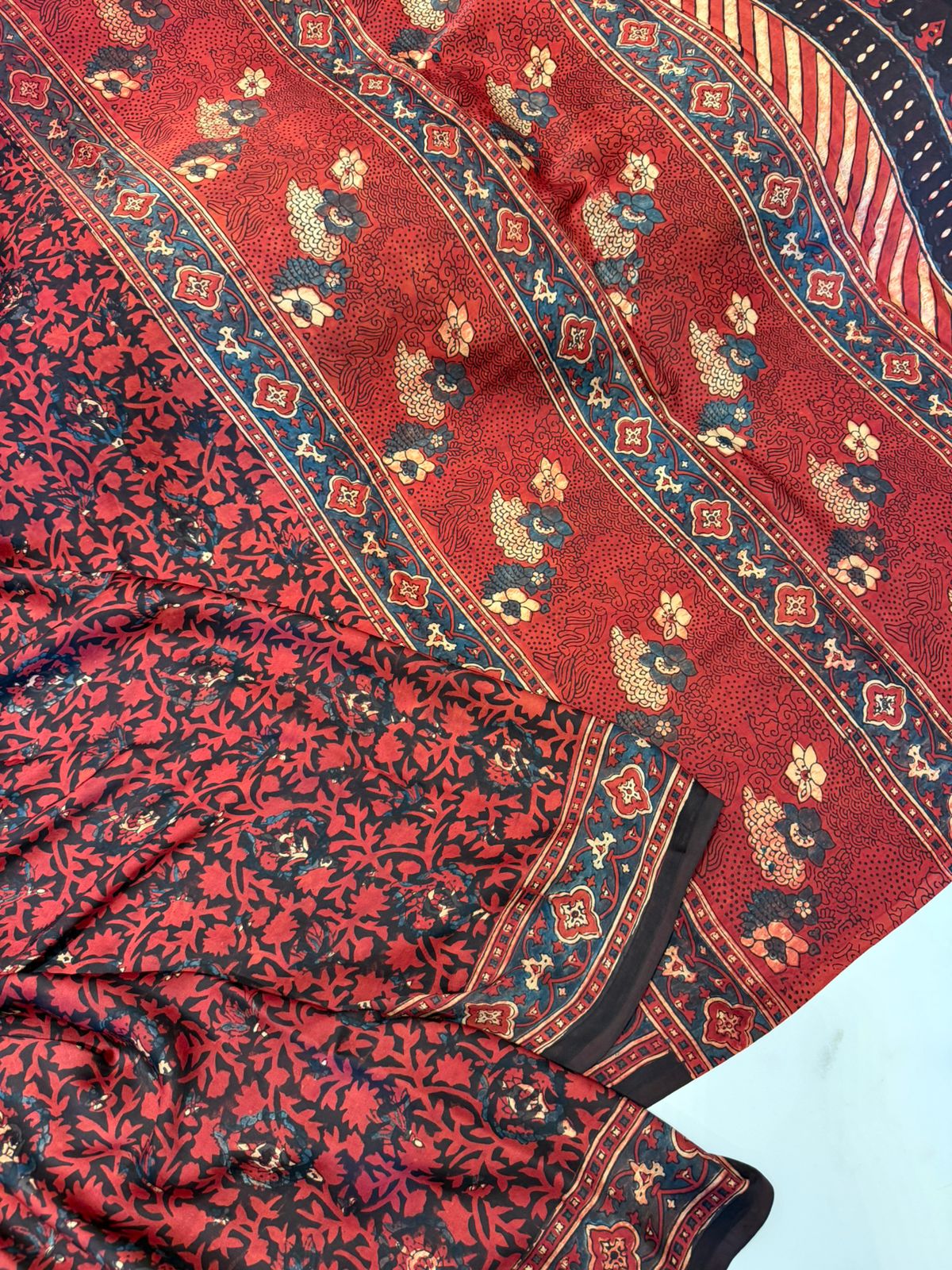 Celebrate timeless craftsmanship with this stunning maroon pure modal crepe silk saree, beautifully adorned with traditional Ajrakh hand block printing. Crafted from a luxurious blend of modal, crepe, and silk, this saree offers a soft, smooth texture with a fluid drape and a subtle sheen—perfect for effortless elegance. The rich...