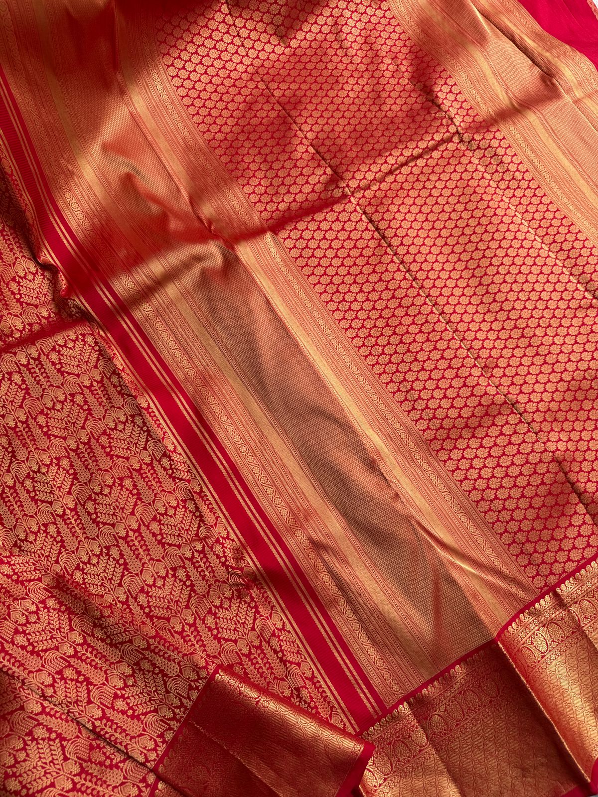 Bold, regal, and timeless — this Carrot Red Pure Kanjeevaram Brocade Silk Saree is a celebration of South Indian weaving heritage. The vibrant carrot red tone radiates festive charm, while the intricate brocade zari weaving adds grandeur and depth, making it a perfect choice for weddings and traditional celebrations. Handwoven with precision by master artisans, this saree embodies the richness of Kanjeevaram silk in its purest form.
