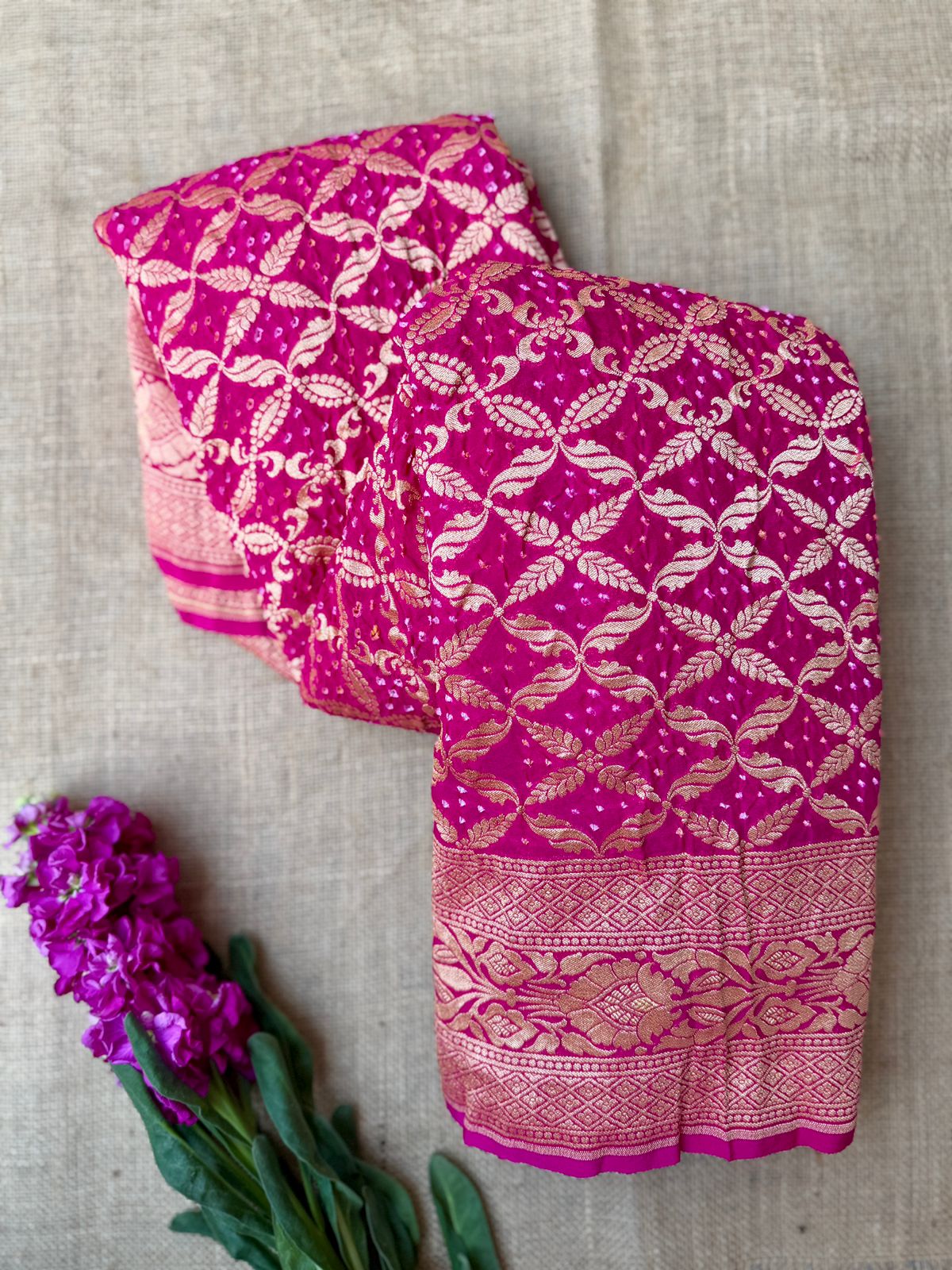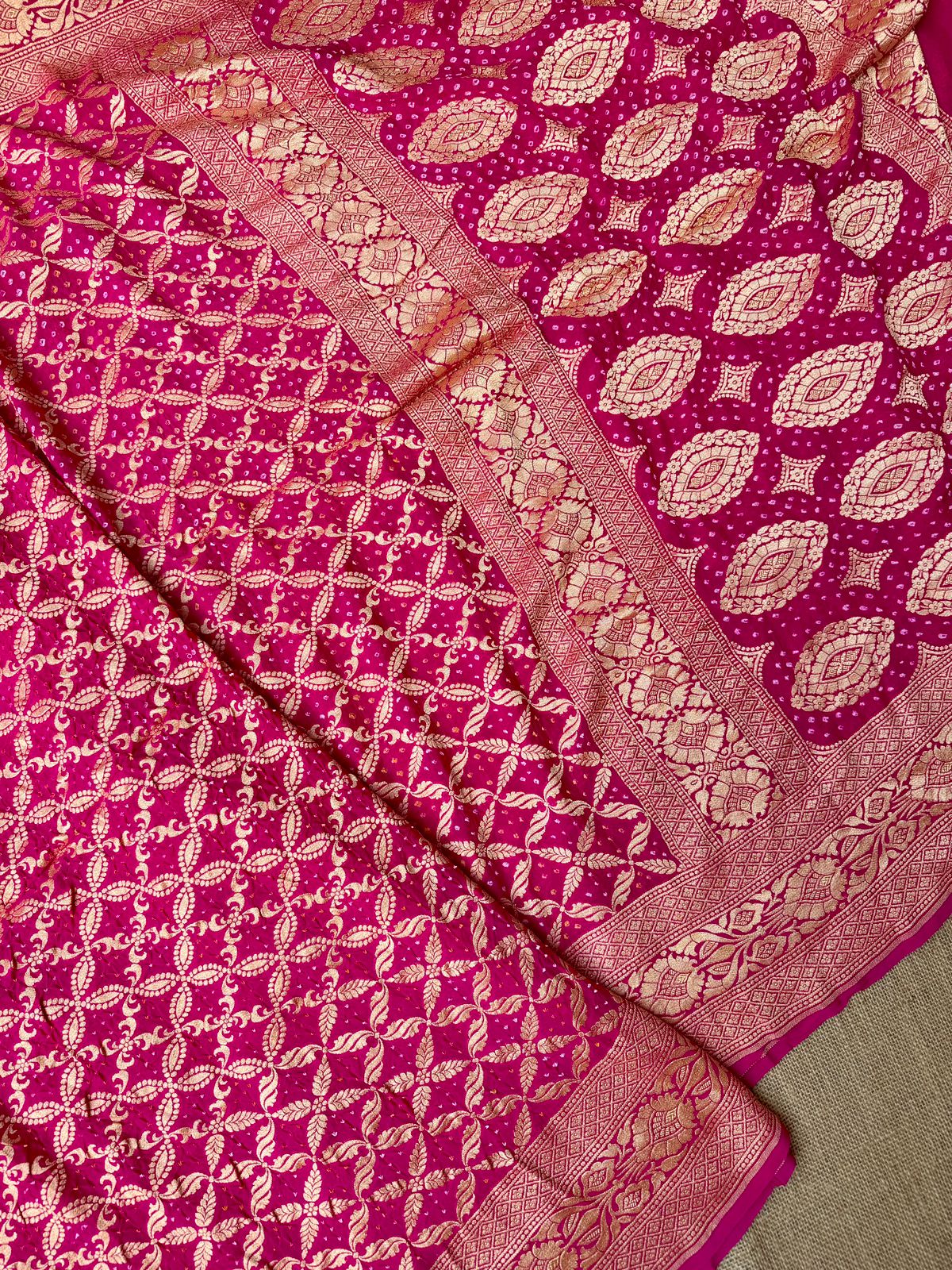 Featuring classic Bandhani dyeing techniques enhanced with all-over intricate weaving, this piece reflects authentic handloom craftsmanship. The rich magenta hue adds a festive glow, making it a standout choice for celebratory occasions.