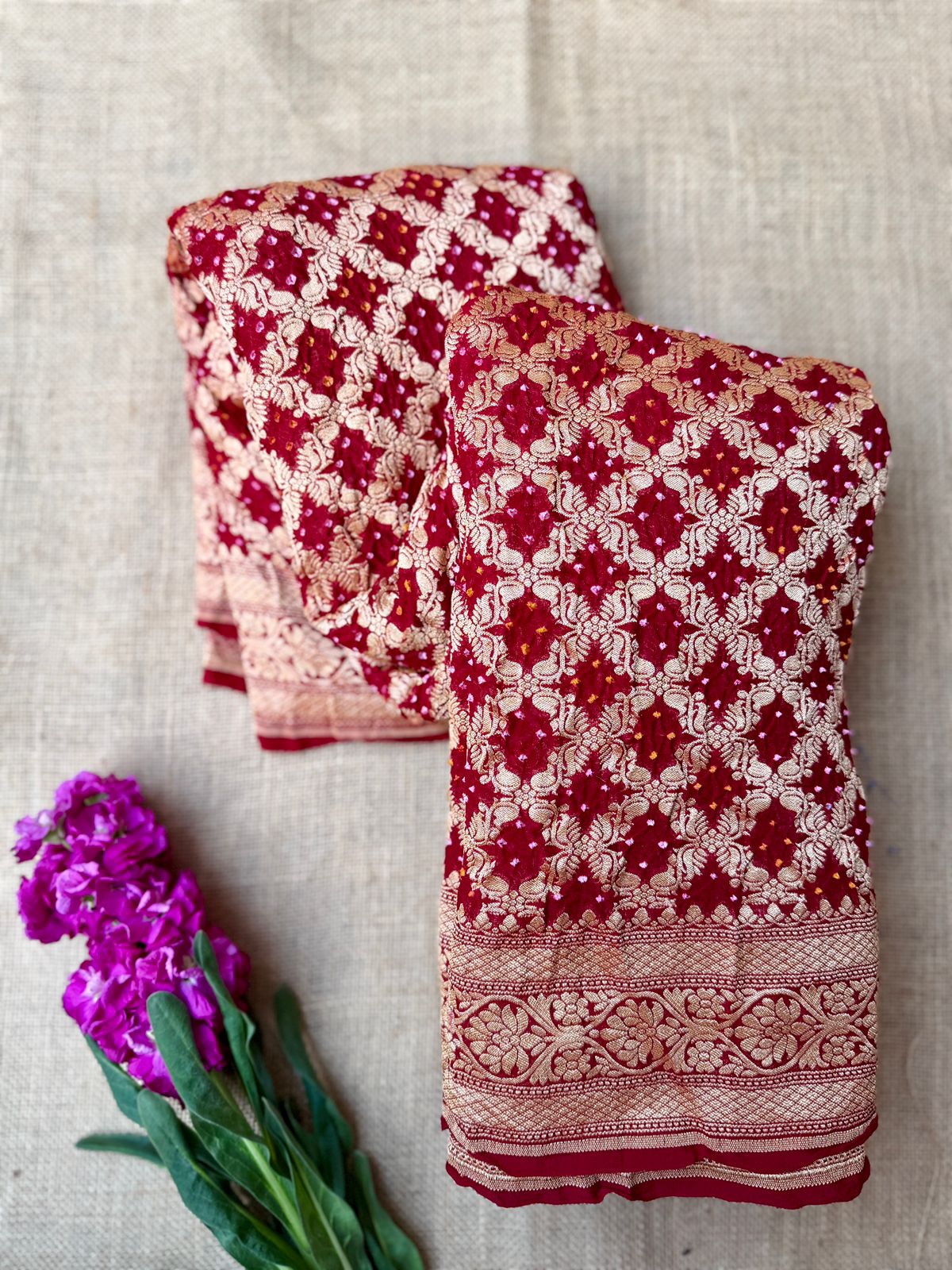 Featuring classic Bandhani dyeing techniques enhanced by all-over intricate weaving, this saree reflects authentic craftsmanship and heritage charm. The bold red hue symbolizes festivity and auspiciousness, making it a perfect choice for grand celebrations.