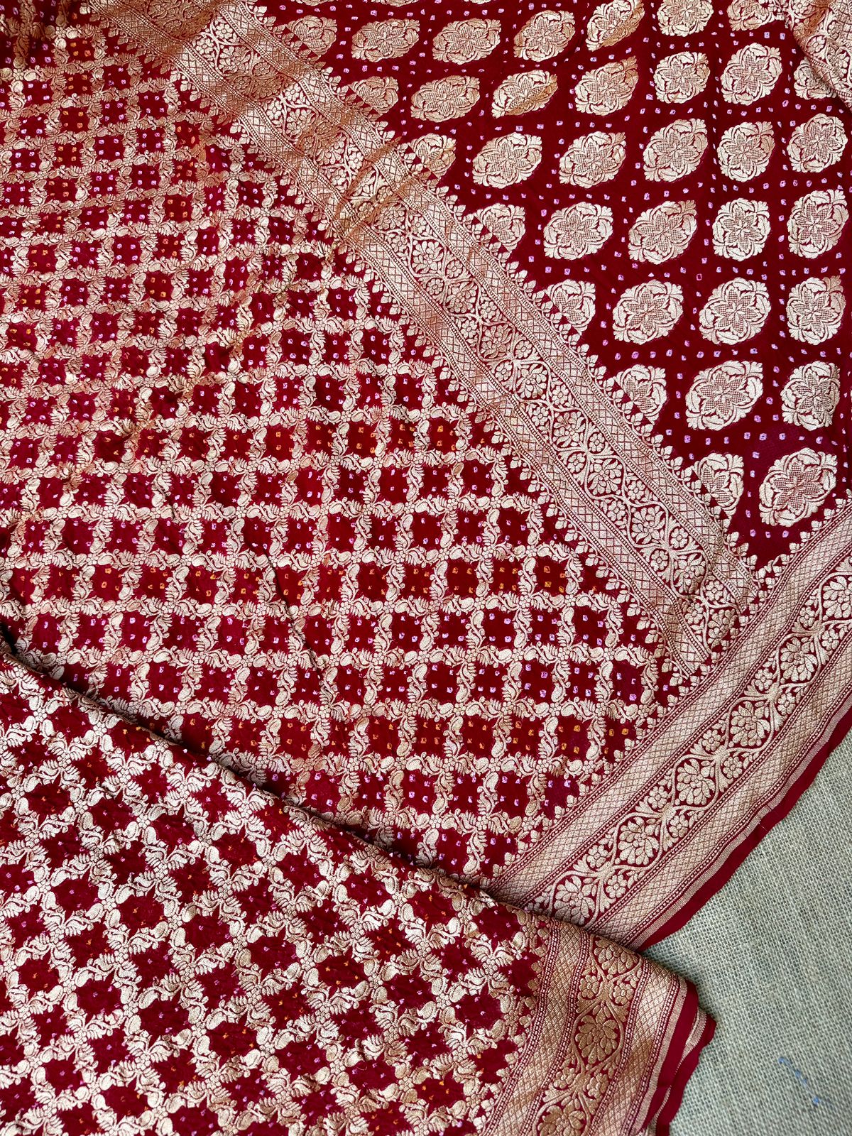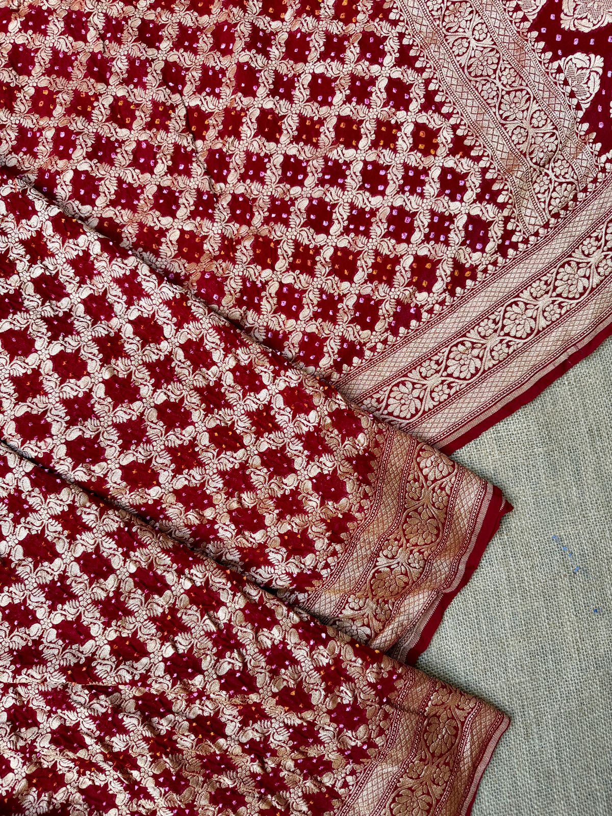 Red color Handloom Pure Khaddi Bandhani Saree with all over weaving