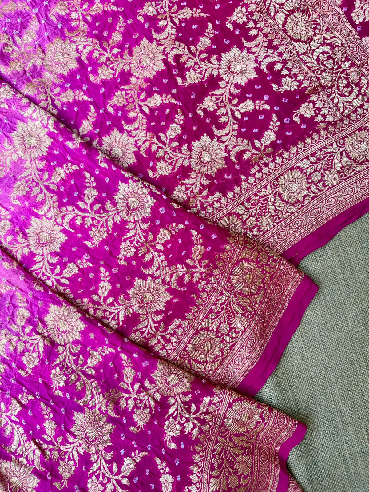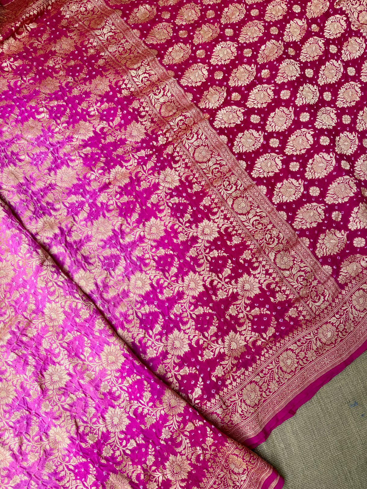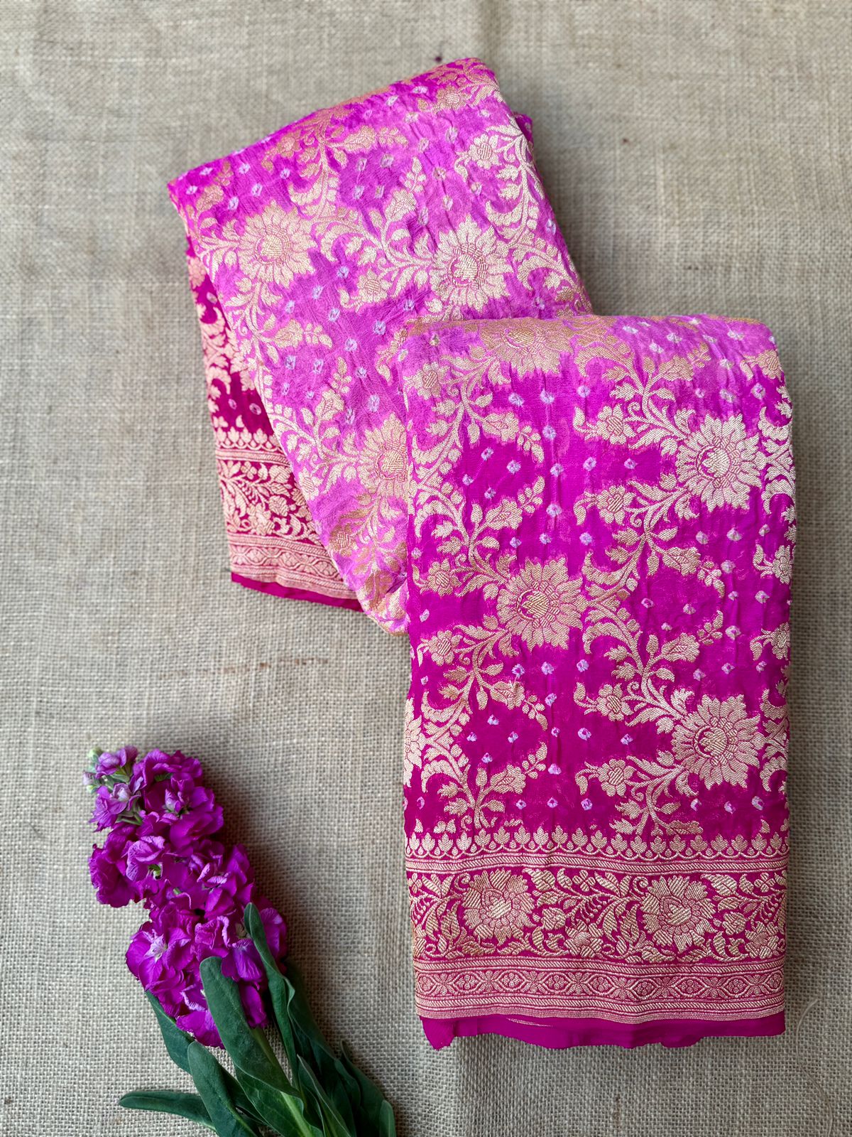 Featuring traditional Bandhani dyeing enhanced by all-over intricate weaving, this piece reflects the richness of authentic handloom artistry. The delicate shaded pink tones add depth and charm, making it a perfect choice for celebratory occasions.