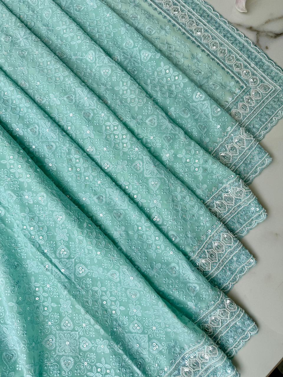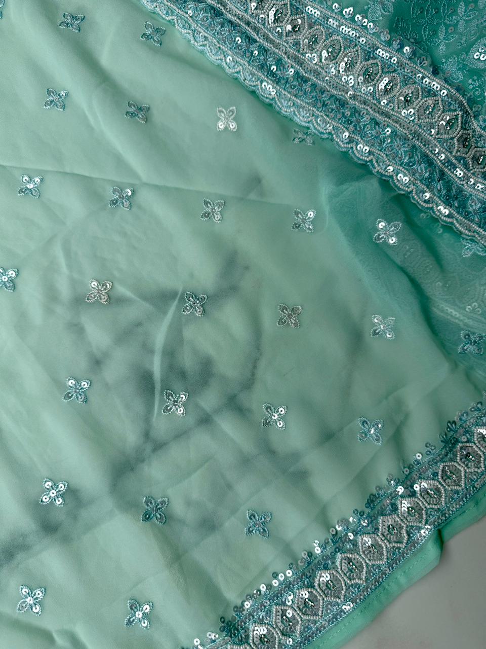Aqua Color Georgette Saree with Resham, Beeds and Sequence Work