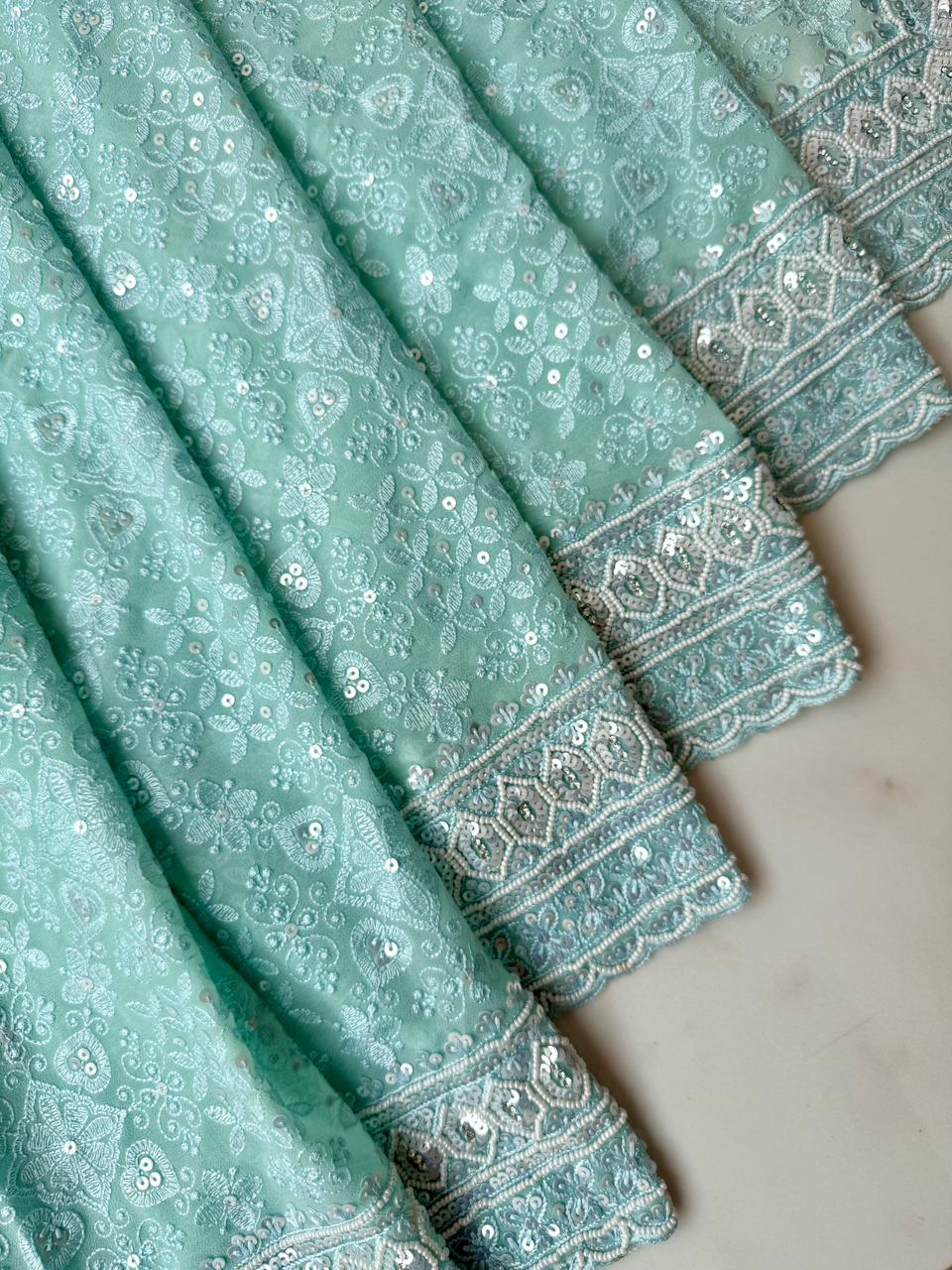 Soft as seafoam and sparkling like early morning dew, this Aqua Georgette Saree is a delicate blend of pastel serenity and festive finesse. Embellished with intricate Resham embroidery, hand-stitched beads, and subtle sequin highlights, it’s a statement in refined elegance — light, breezy, and luxuriously detailed.