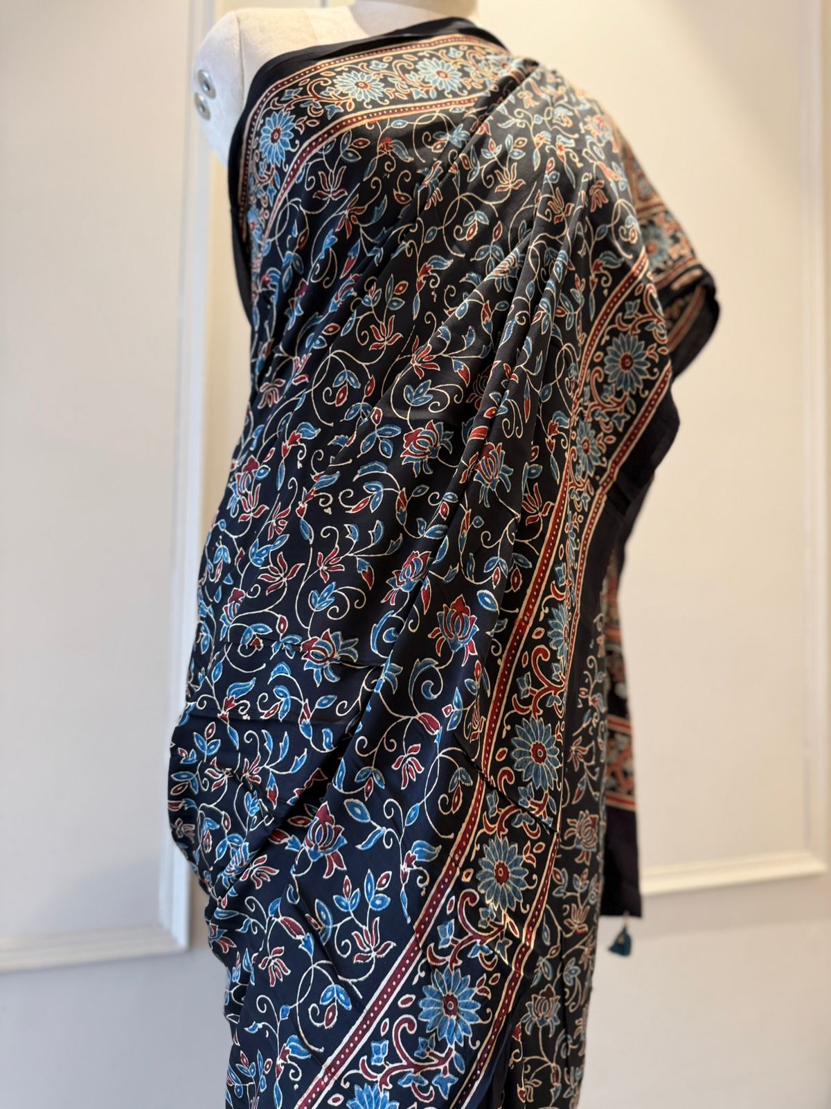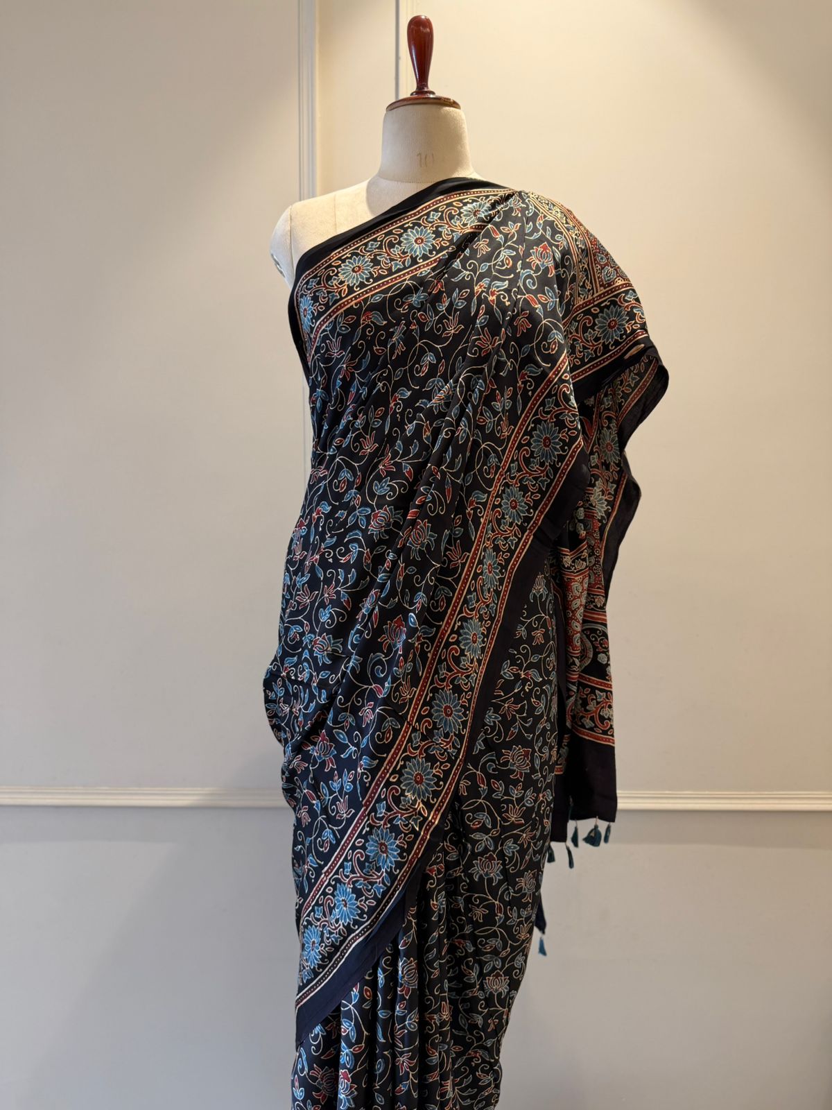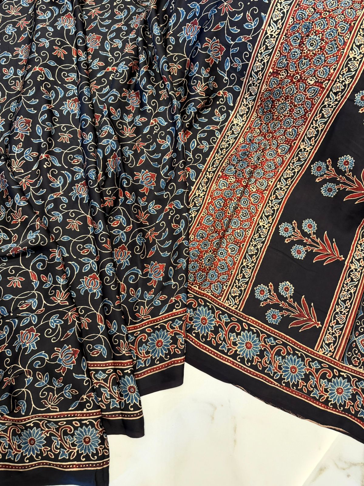 The deep black base creates a striking canvas for intricate Ajrakh prints, featuring classic geometric and heritage-inspired motifs. Created using age-old hand block techniques, the detailed patterns reflect fine craftsmanship and cultural richness. A neatly defined border and an elegantly designed pallu complete this graceful ensemble.