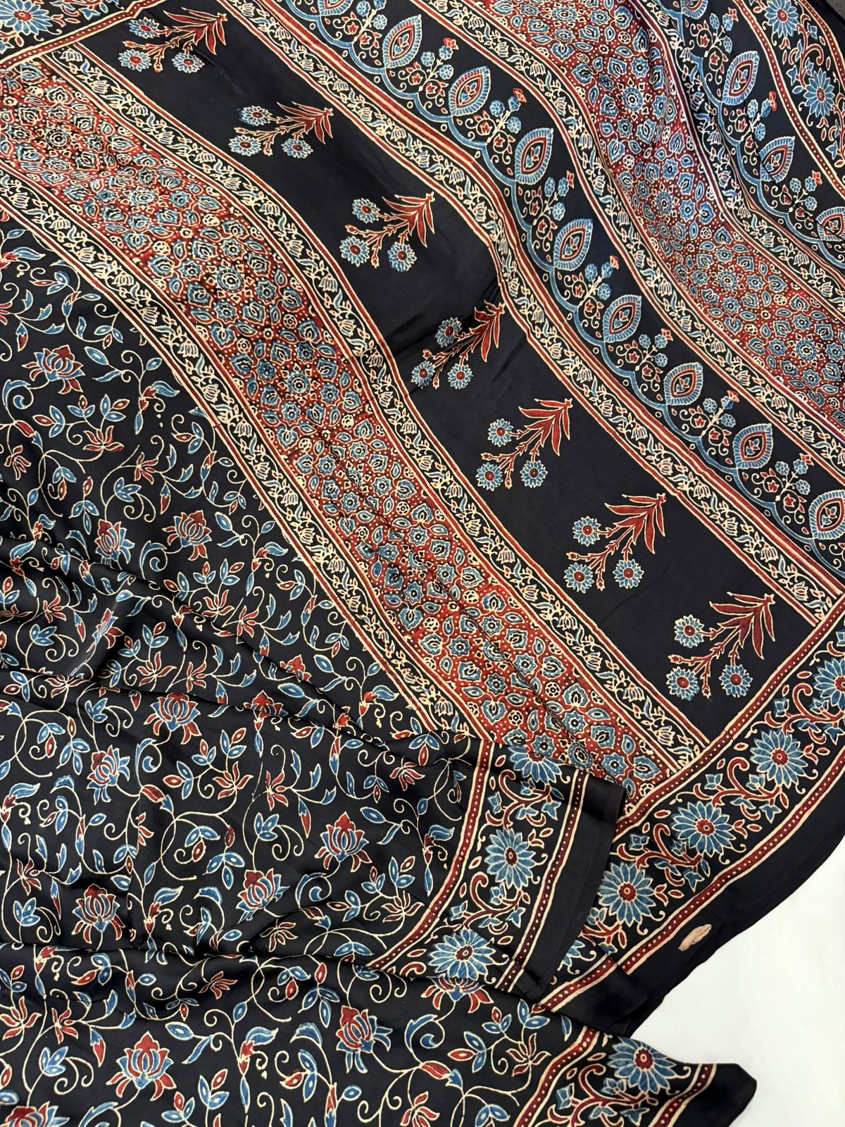 Black color Pure Modal Crepe Ajrakh Hand Block Printed Saree