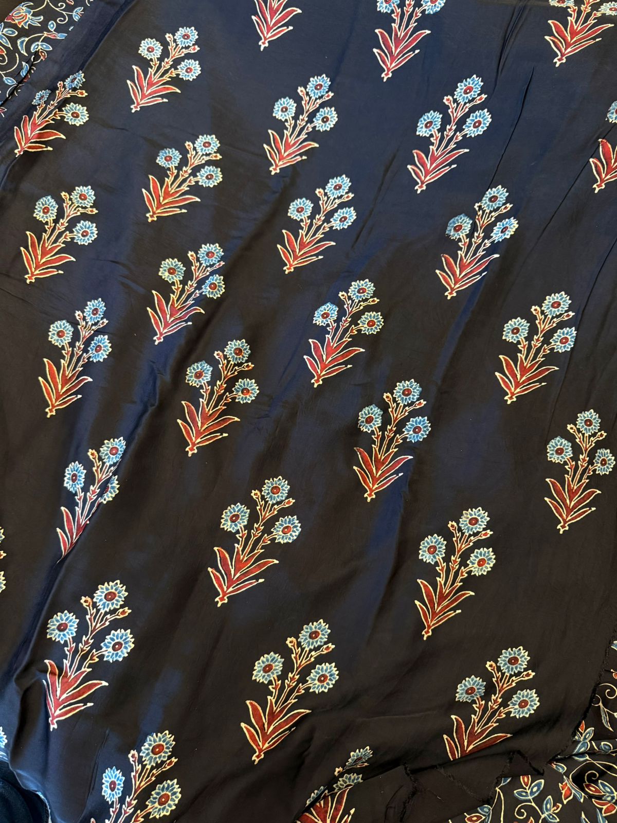 Step into timeless sophistication with this stunning black pure modal crepe saree, beautifully adorned with traditional Ajrakh hand block printing. Crafted from soft and flowy modal crepe fabric, this saree offers a smooth texture, fluid drape, and a subtle sheen—perfect for effortless elegance.