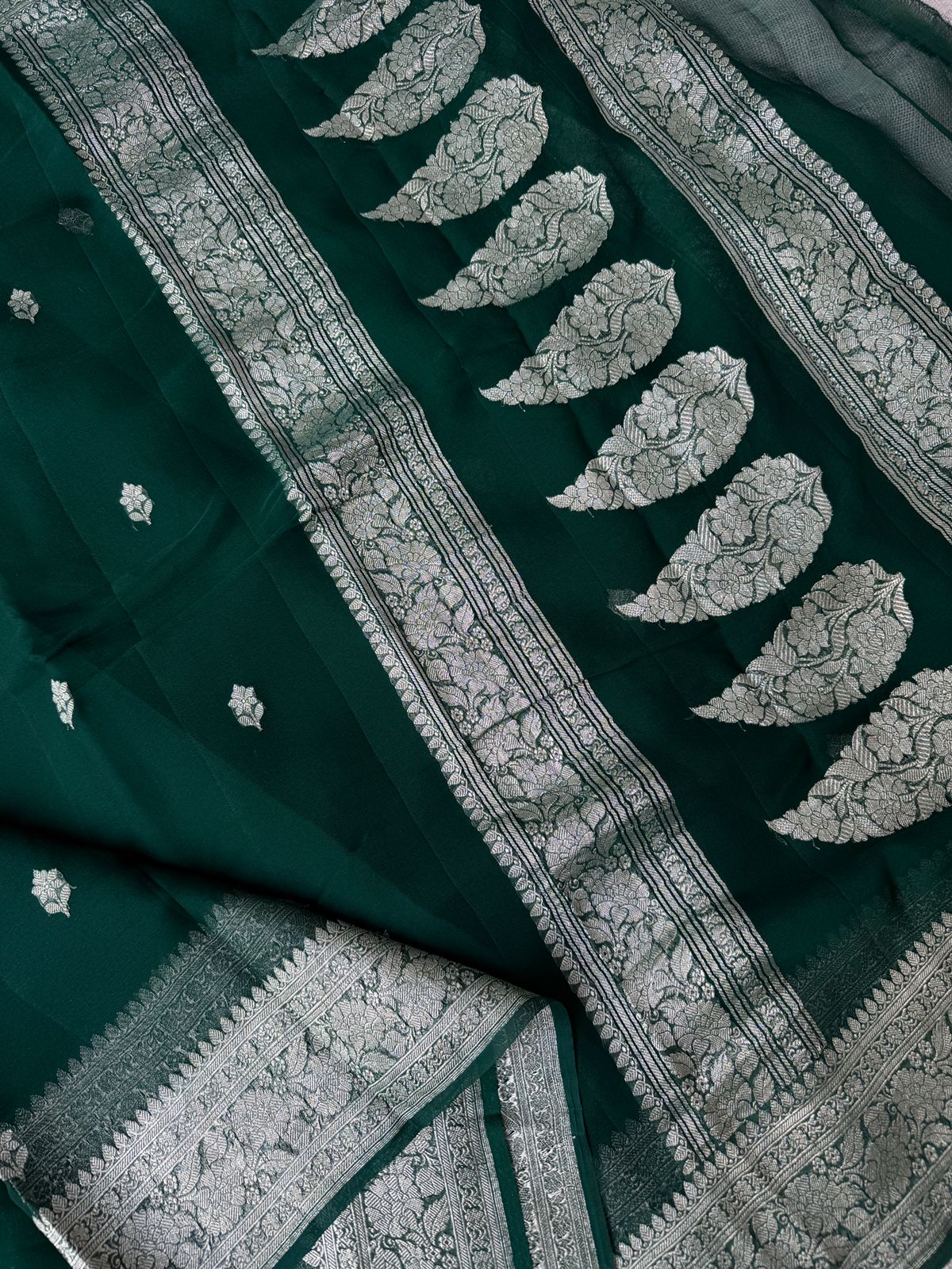 Dark Green Khaddi Hand woven Pure Benarasi Georgette Saree with zari weaving