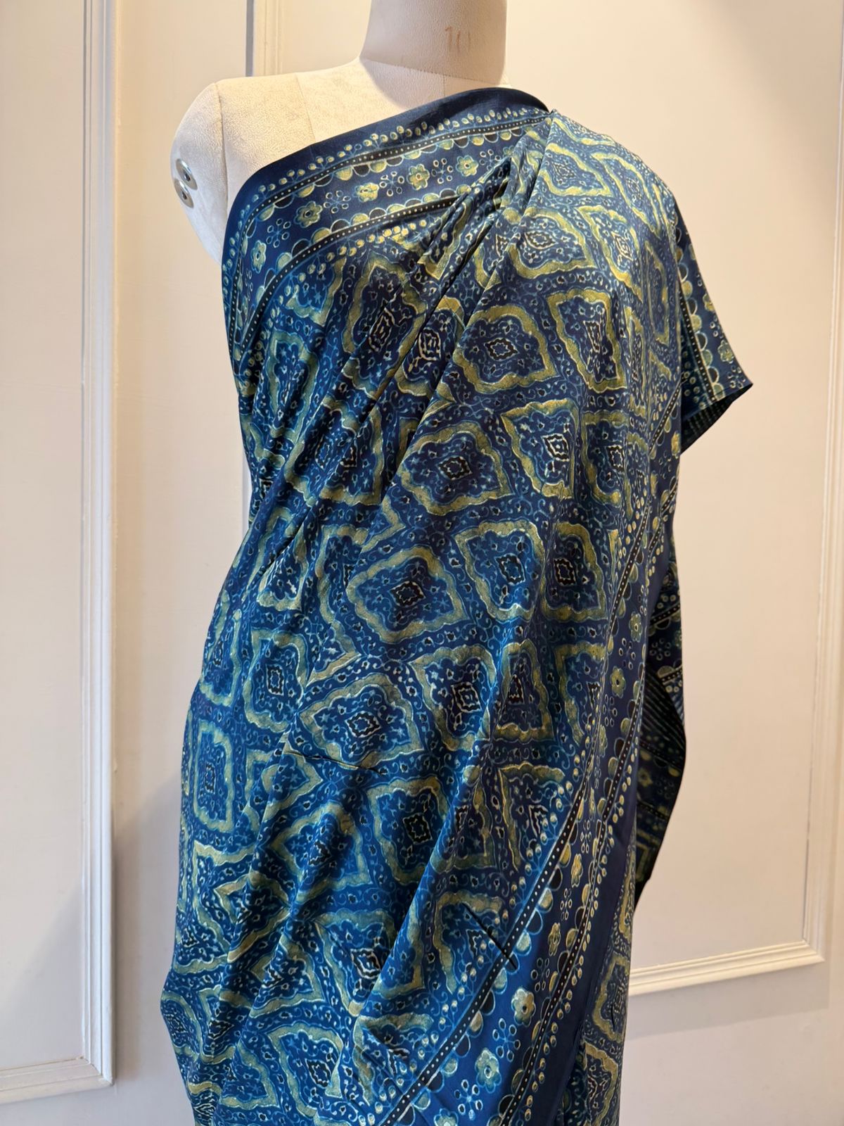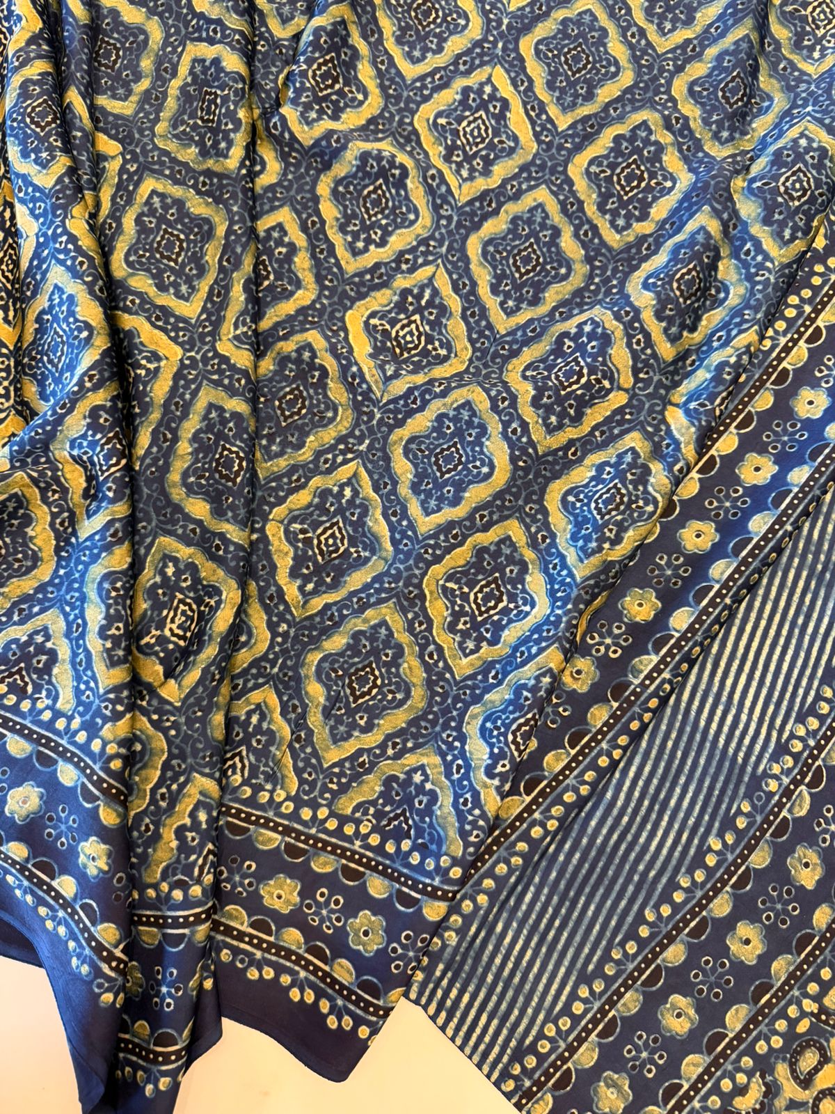 Indigo color Pure Modal Silk Saree with Hand Ajrakh Block Printing