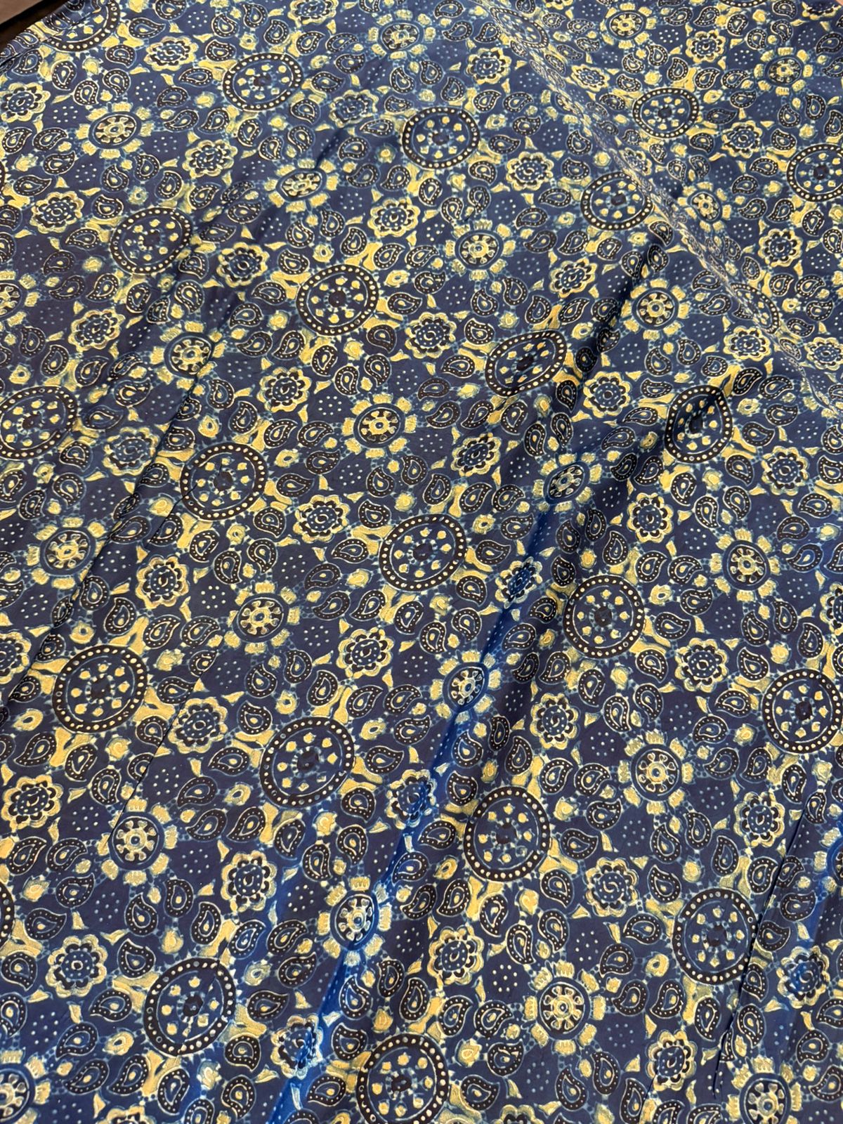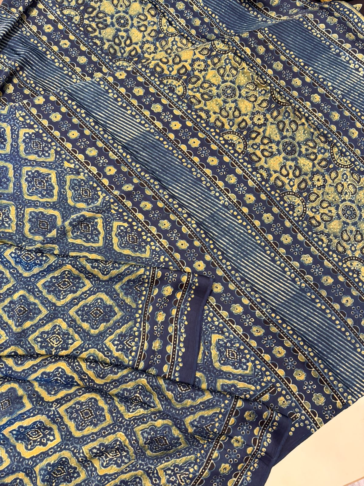 The deep indigo hue creates a rich and classic base, enhanced with intricate Ajrakh prints featuring geometric and heritage-inspired patterns. Created using age-old hand block techniques, the detailed motifs reflect fine craftsmanship and cultural richness. A well-defined border and an elegantly designed pallu complete the saree with refined charm.