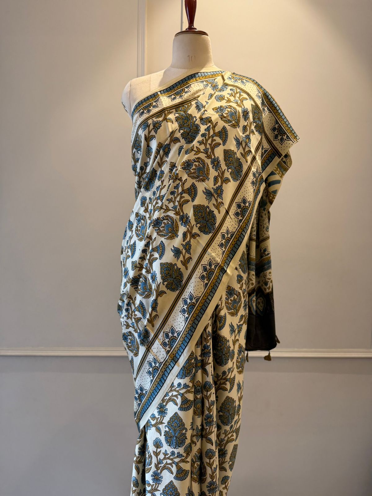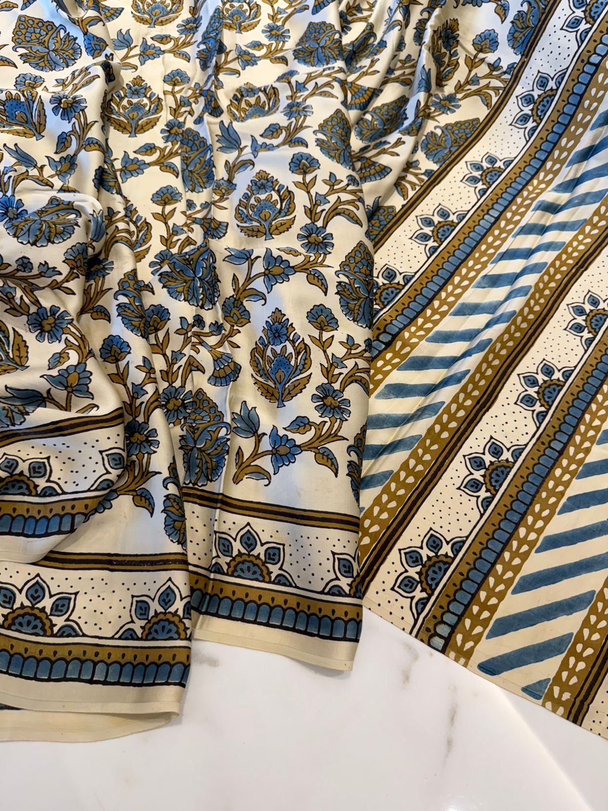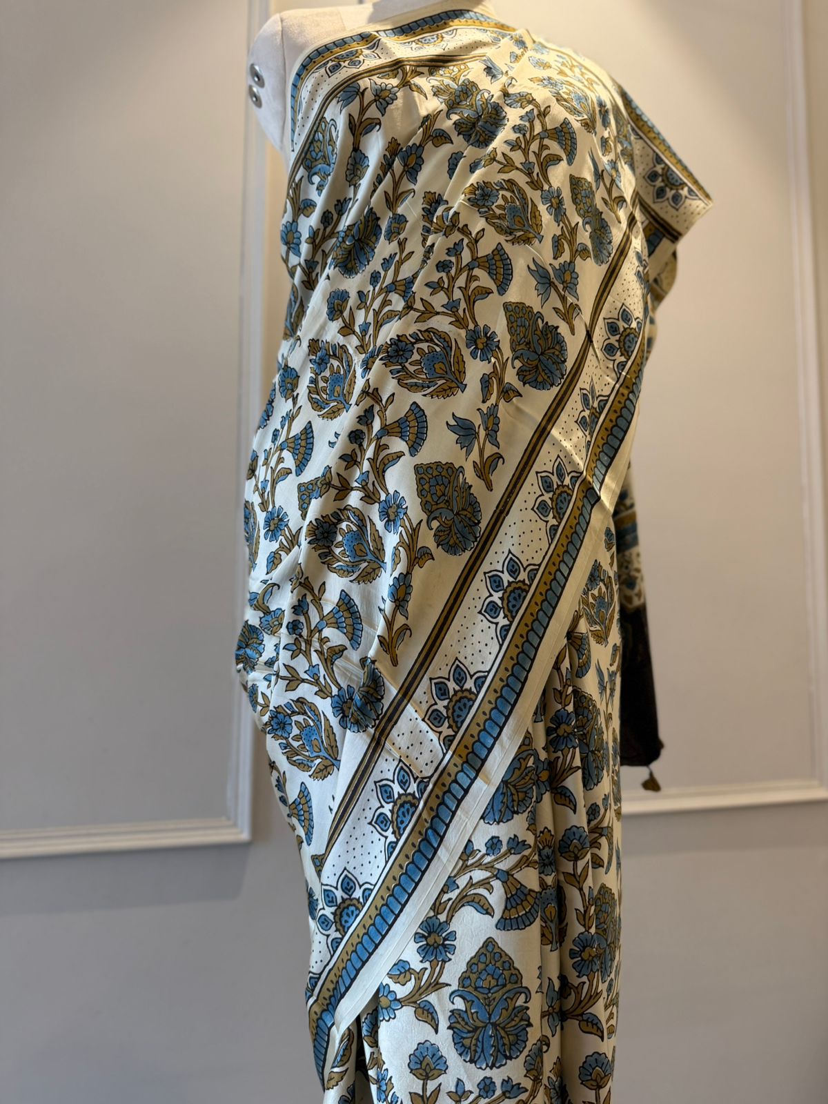 Ivory color Pure Ajrakh Modal Hand Block Printed Saree