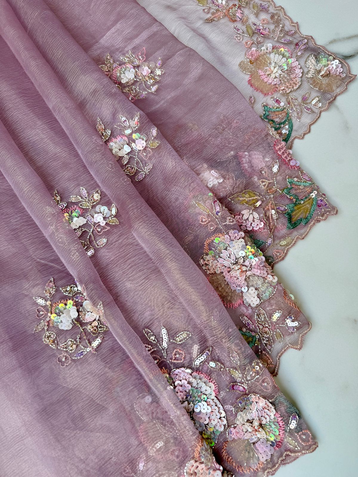 Lavender color Wrinkled Tissue Saree with Nalki, Sequence, Seep & Jarkan Work