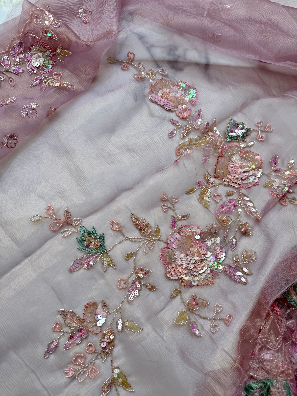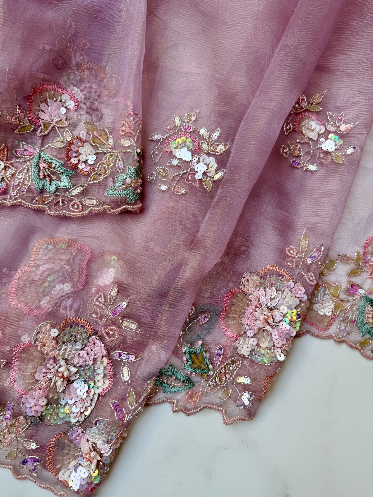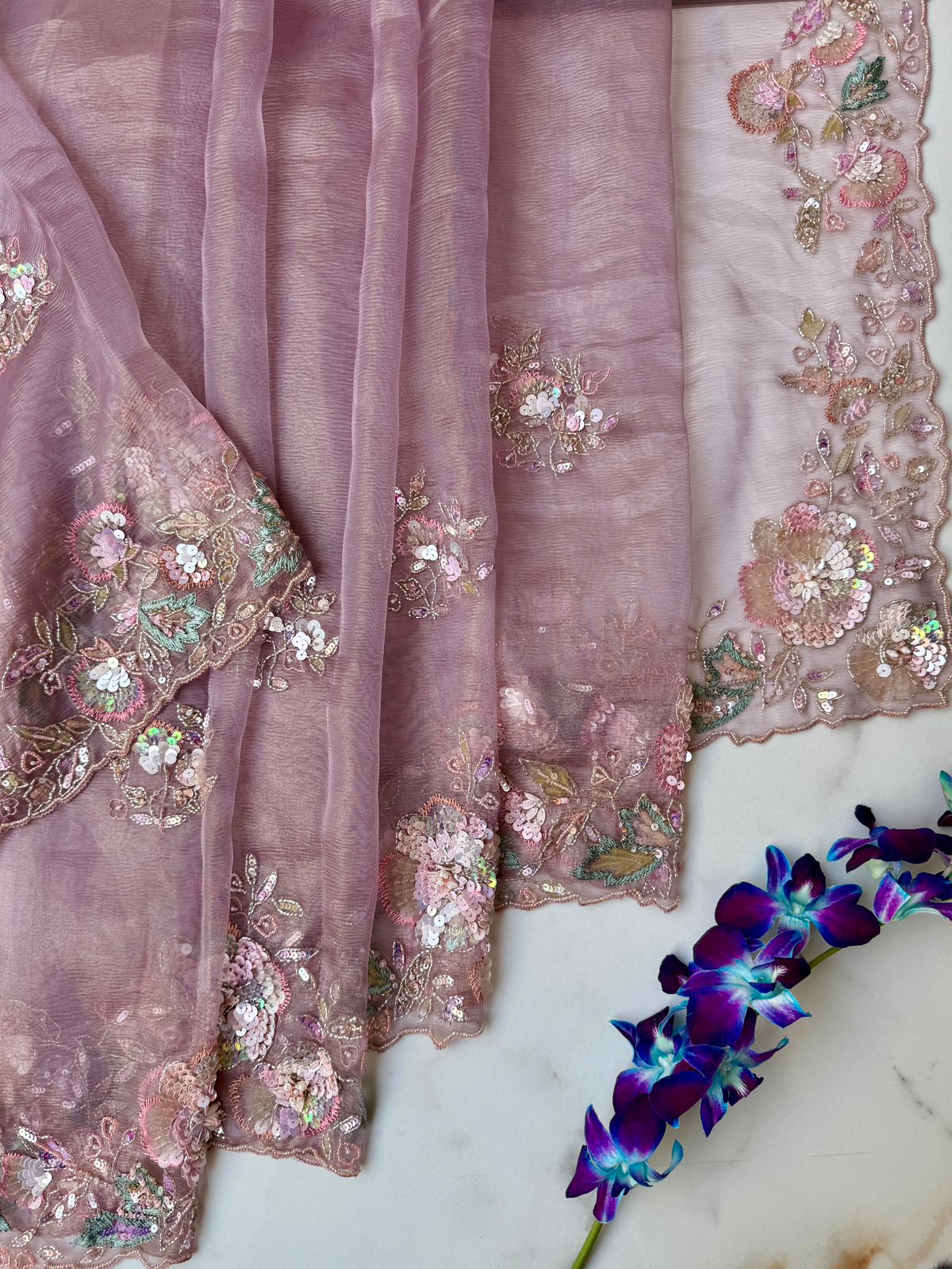 Soft, dreamy, and beautifully detailed—the Lavender Wrinkled Tissue Saree is a perfect blend of contemporary charm and traditional craftsmanship. The wrinkled tissue fabric offers a graceful, lightweight drape with a natural sheen that enhances its luxurious appeal.