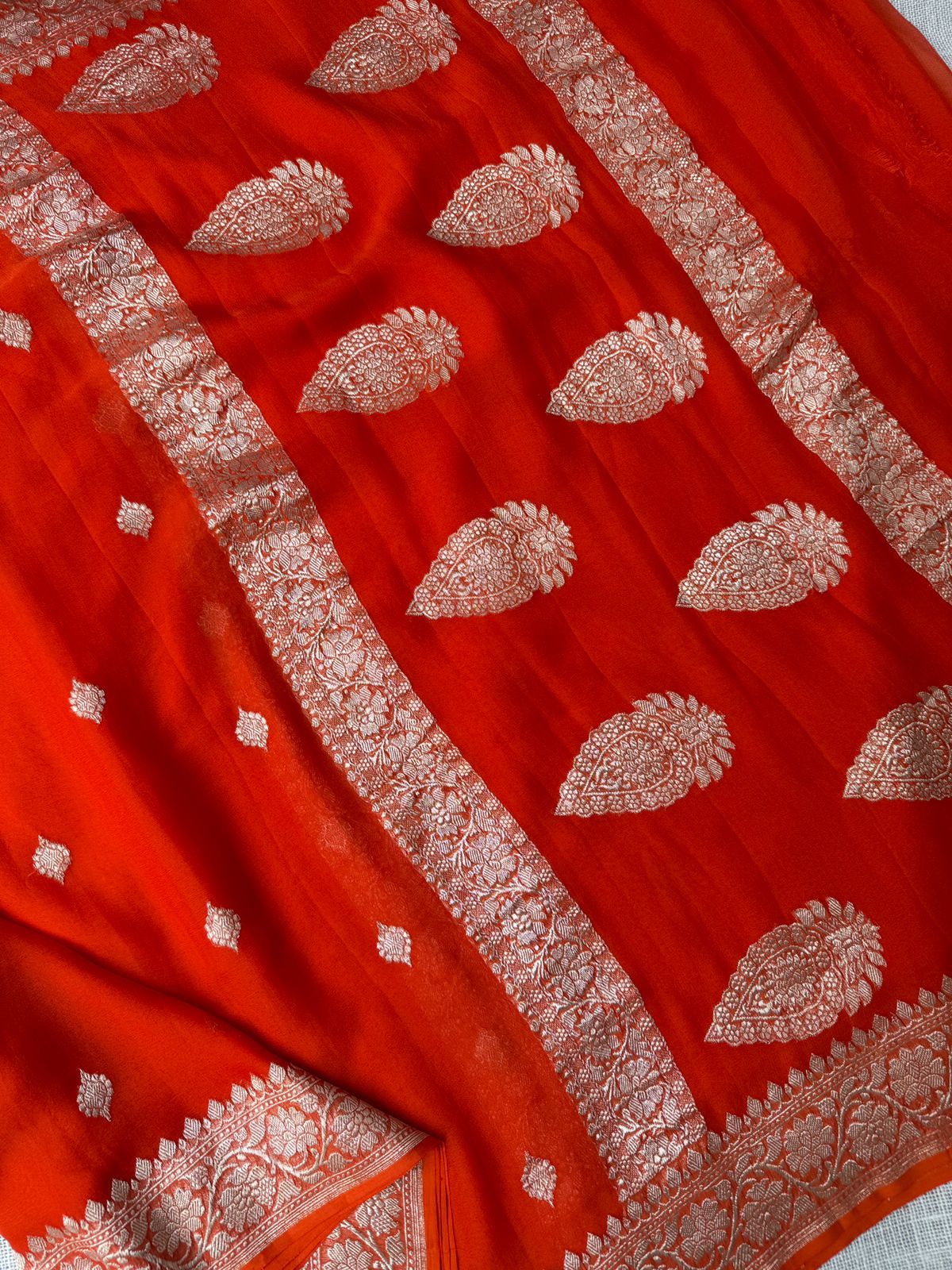 Orange color pure Khaddi Hand woven Benarasi Georgette Saree with zari weaving