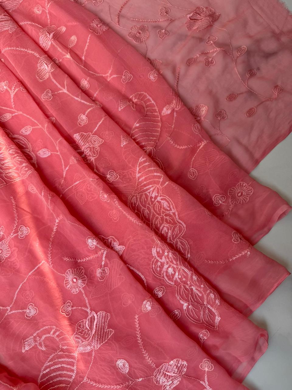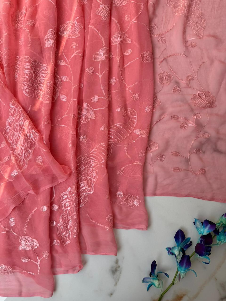Peach color Peacock design Chiffon Saree with Resham work and water sequence work