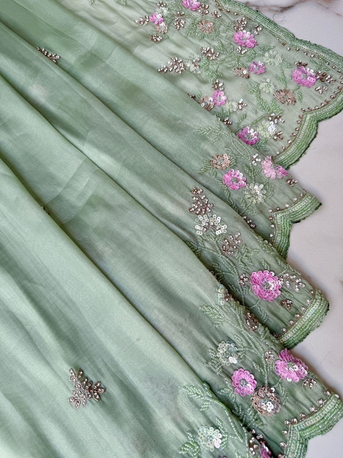 Hand-embellished with sequins, beads, Kundan, and Moti (pearls), the saree showcases fine craftsmanship that sparkles delicately with every movement. The pastel pista shade adds a refreshing, youthful charm, making it perfect for both day and evening celebrations.