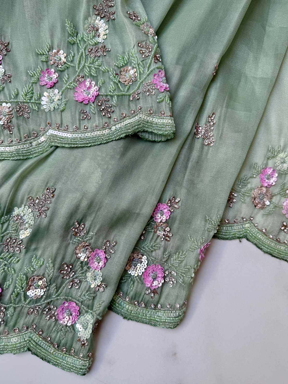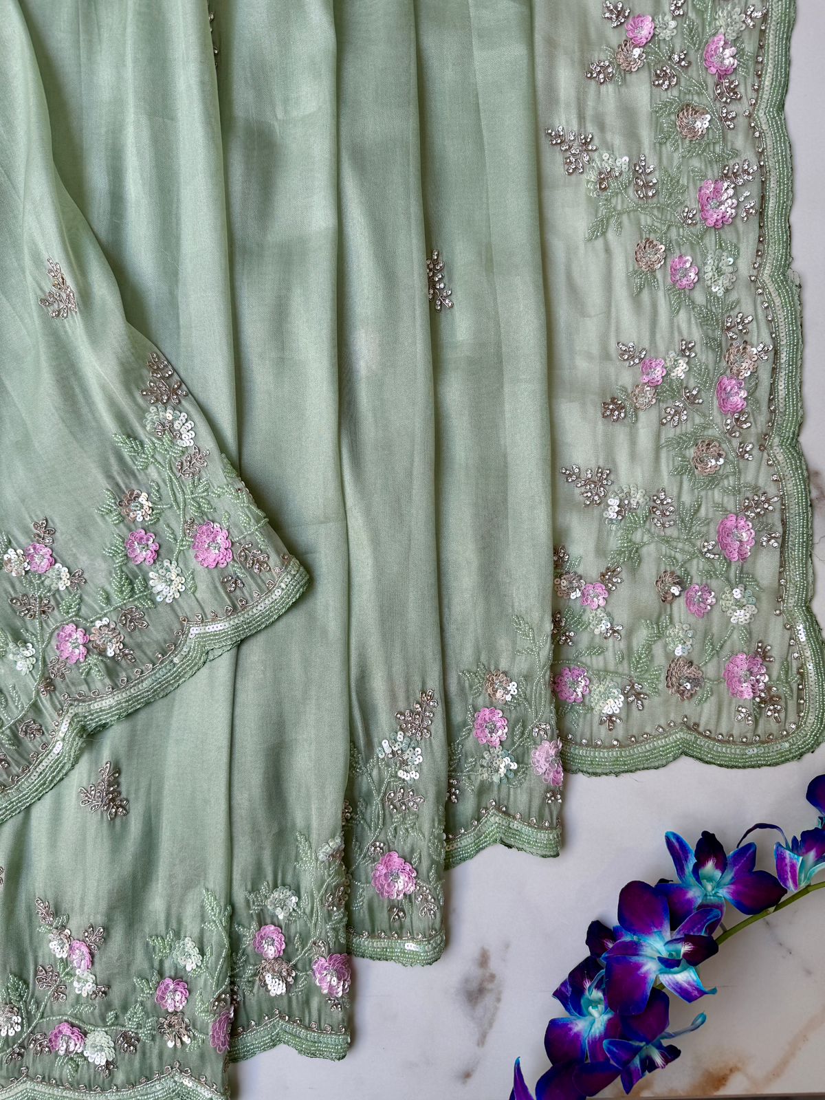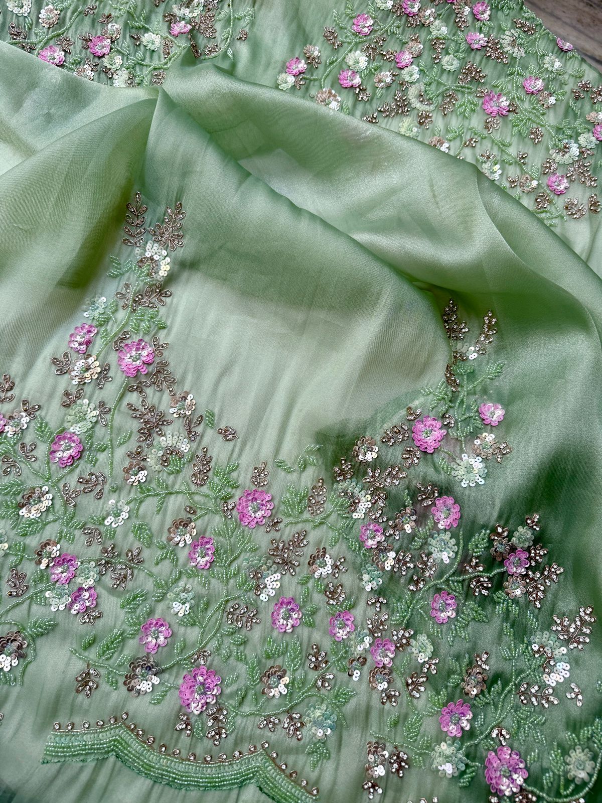 Pista color Pure Organza Saree with sequence, Beeds, Kundan and Moti embroidery