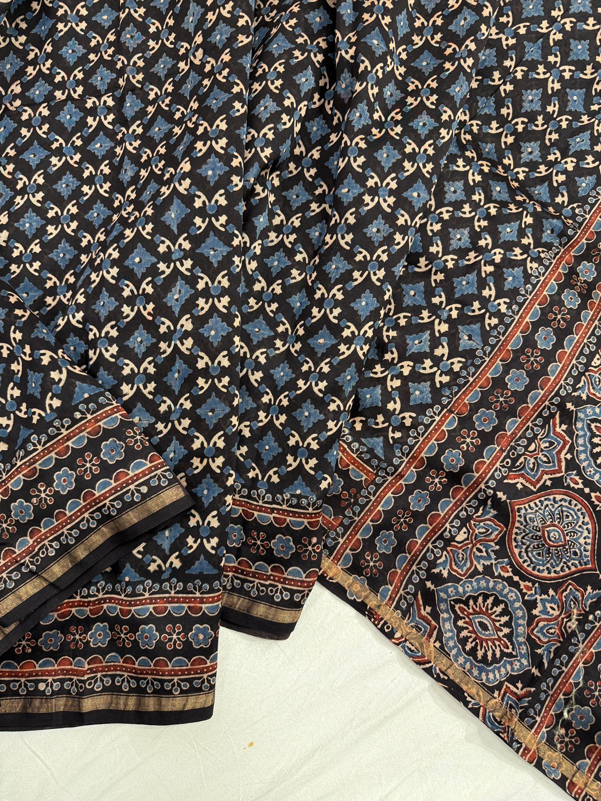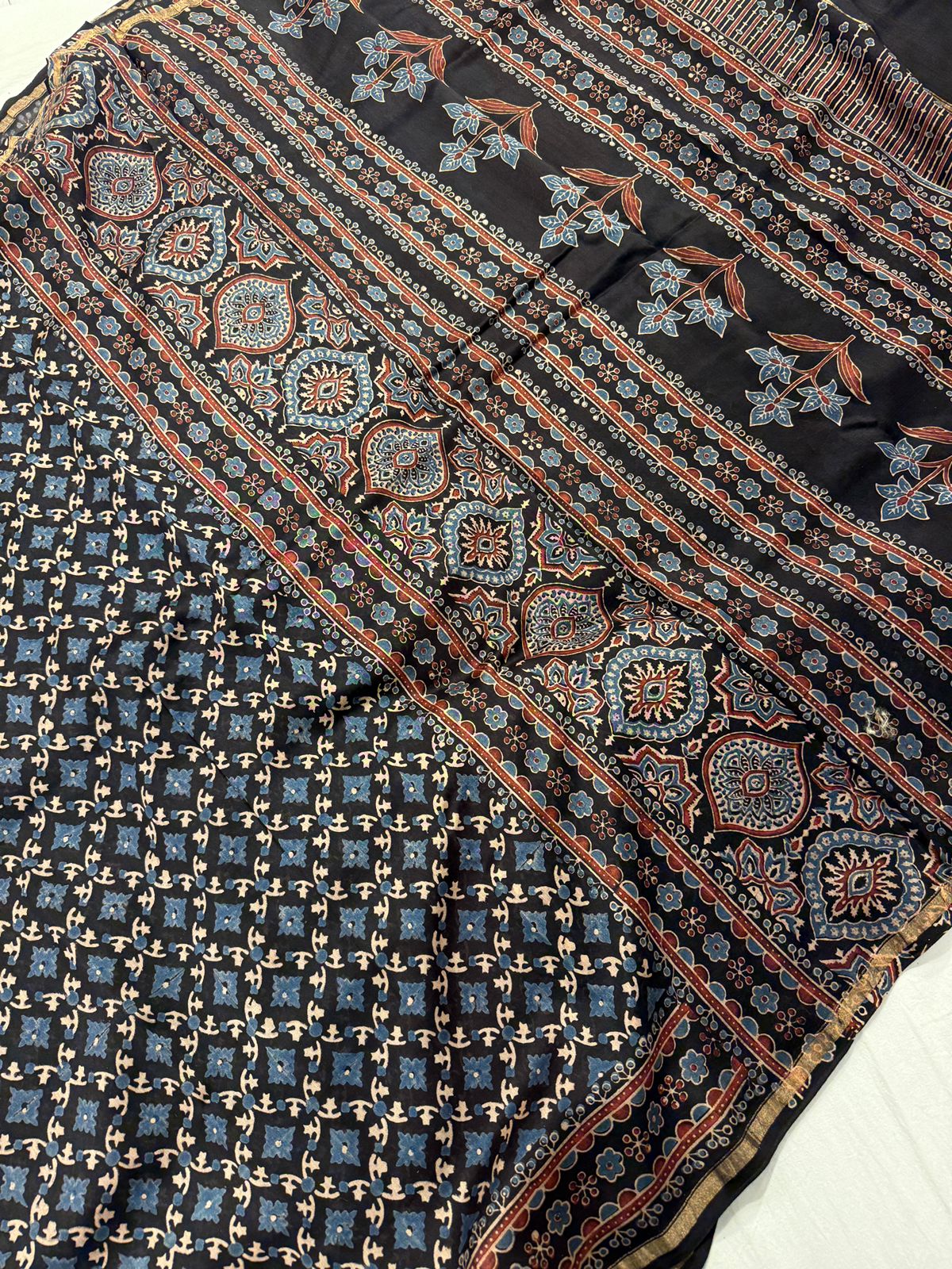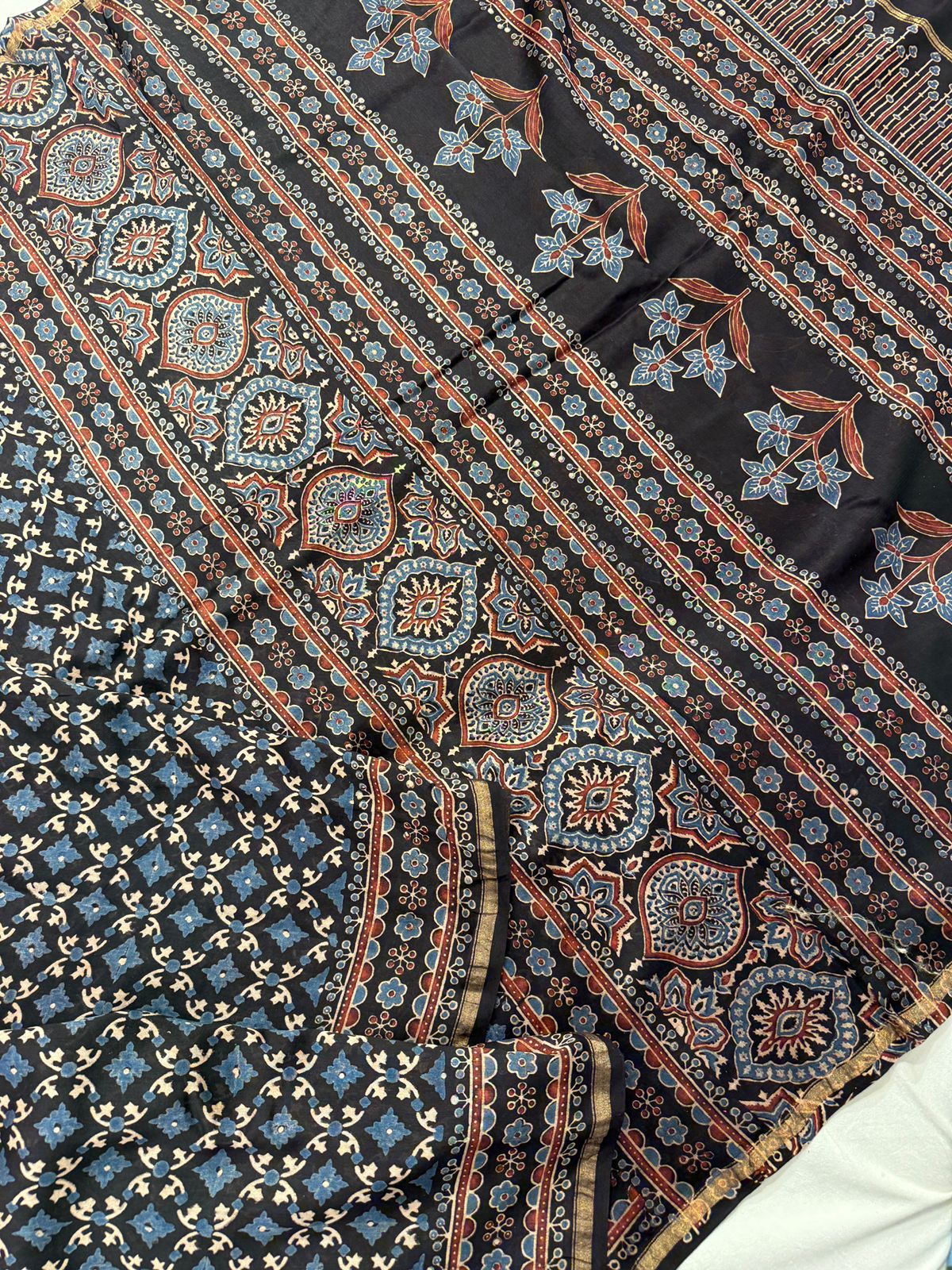 The saree features intricate Ajrakh prints, showcasing geometric and heritage-inspired motifs created using age-old hand block techniques. These detailed patterns reflect fine artisanal precision and cultural richness. The elegant Maheshwari border, with its signature stripes and delicate zari accents, adds a refined traditional touch, while the beautifully crafted pallu completes the ensemble with sophistication.