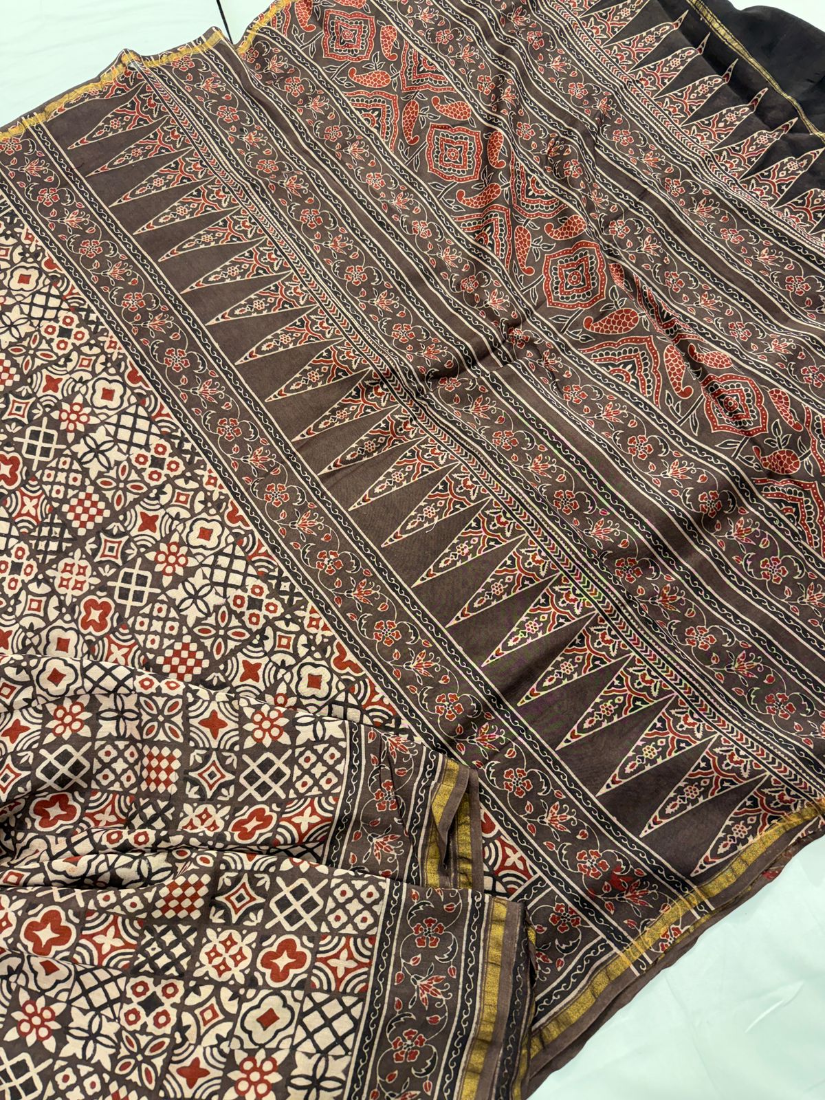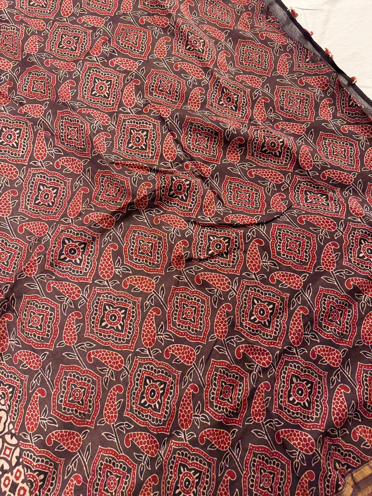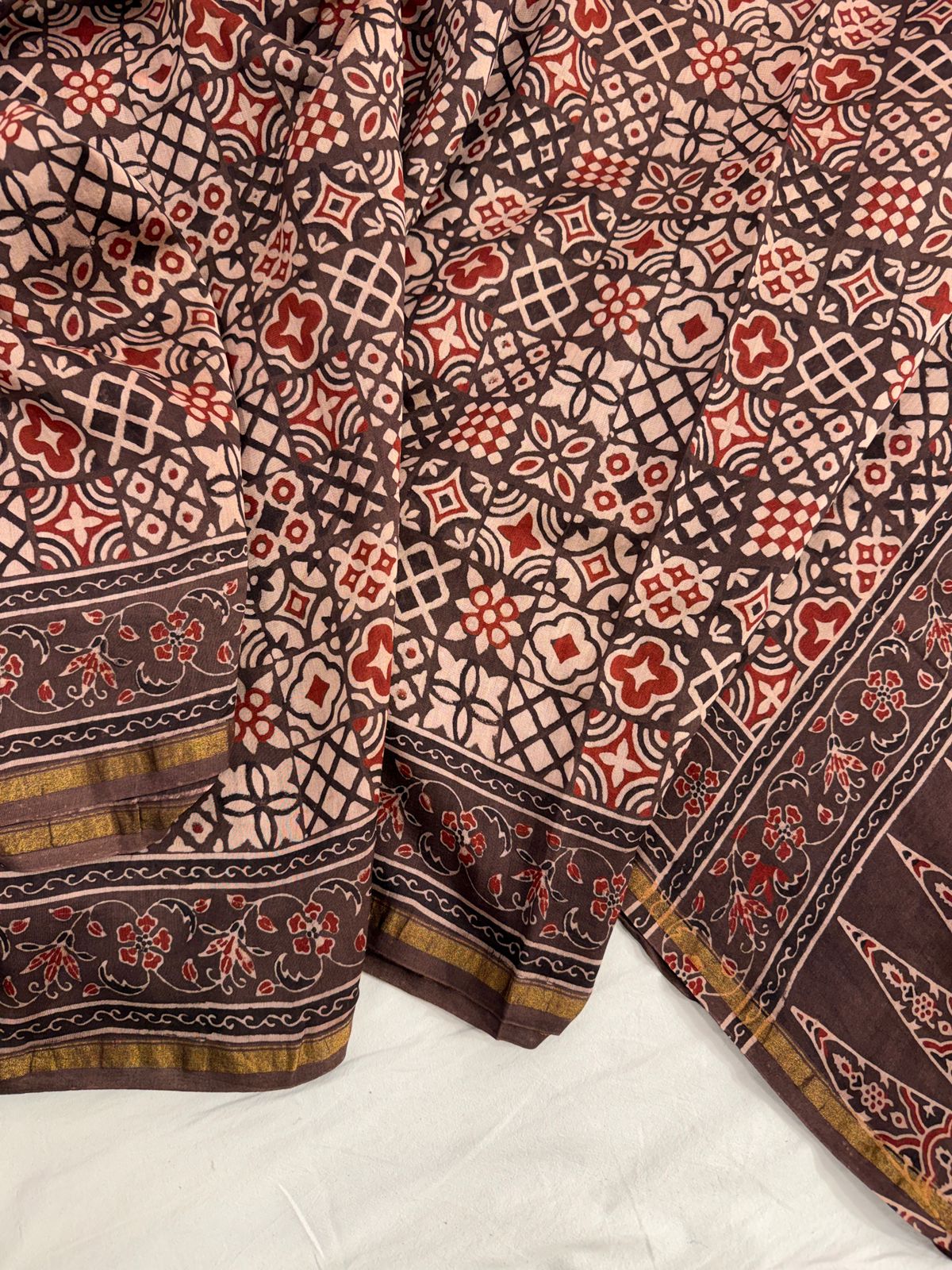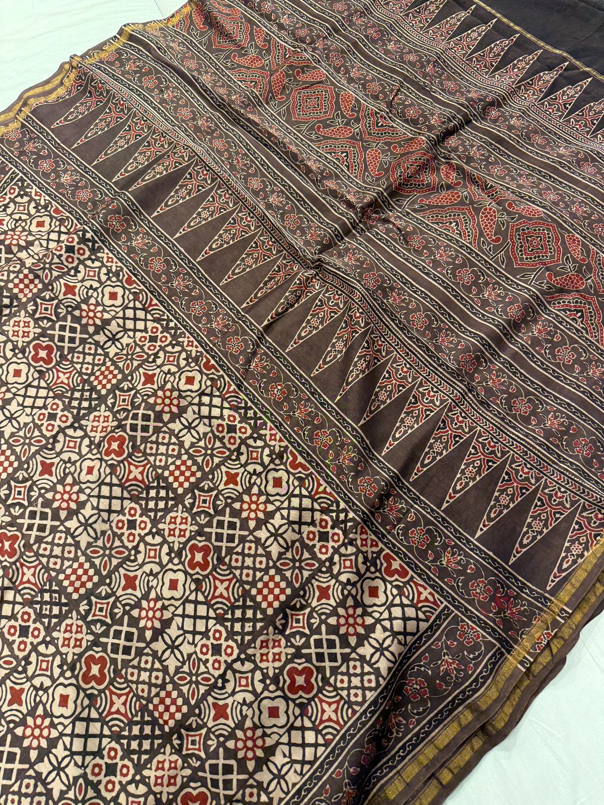 Pure Chanderi Saree with Hand Block Ajrakh Prints with Maheshwari bord – Khiamalssarees