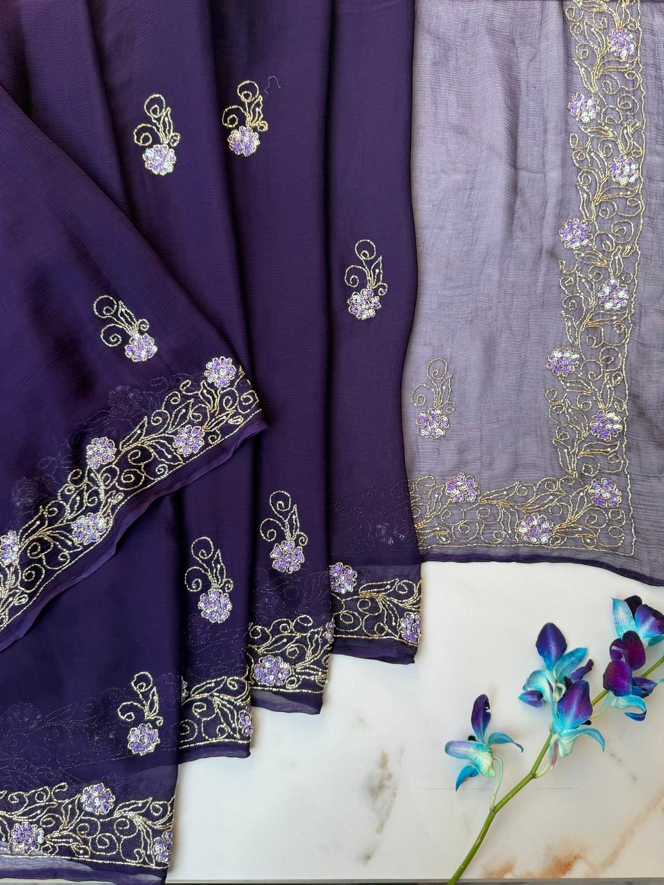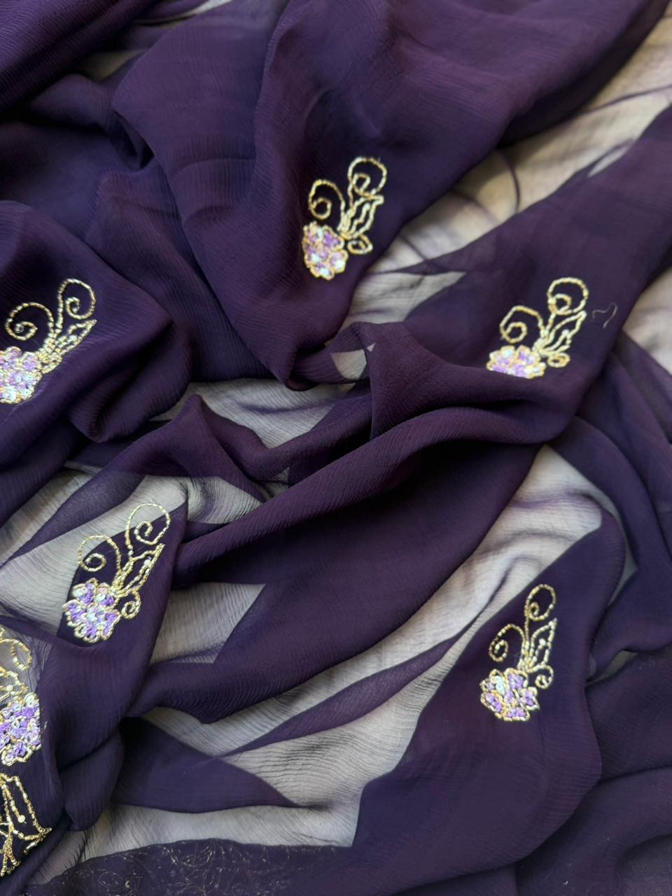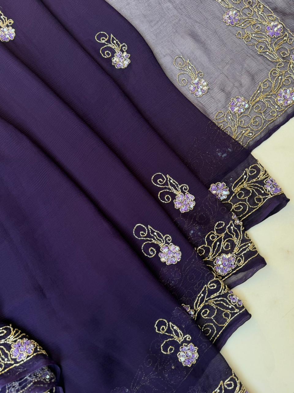 Purple color chiffon saree with cut-dana, Sequence and Nalki Hand Embroidery
