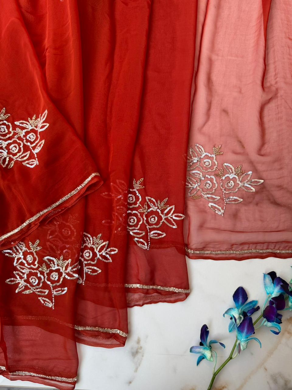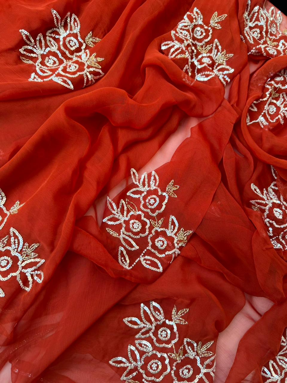 Rust color Chiffon Saree with Sequence and Nalki Hand Embroidery