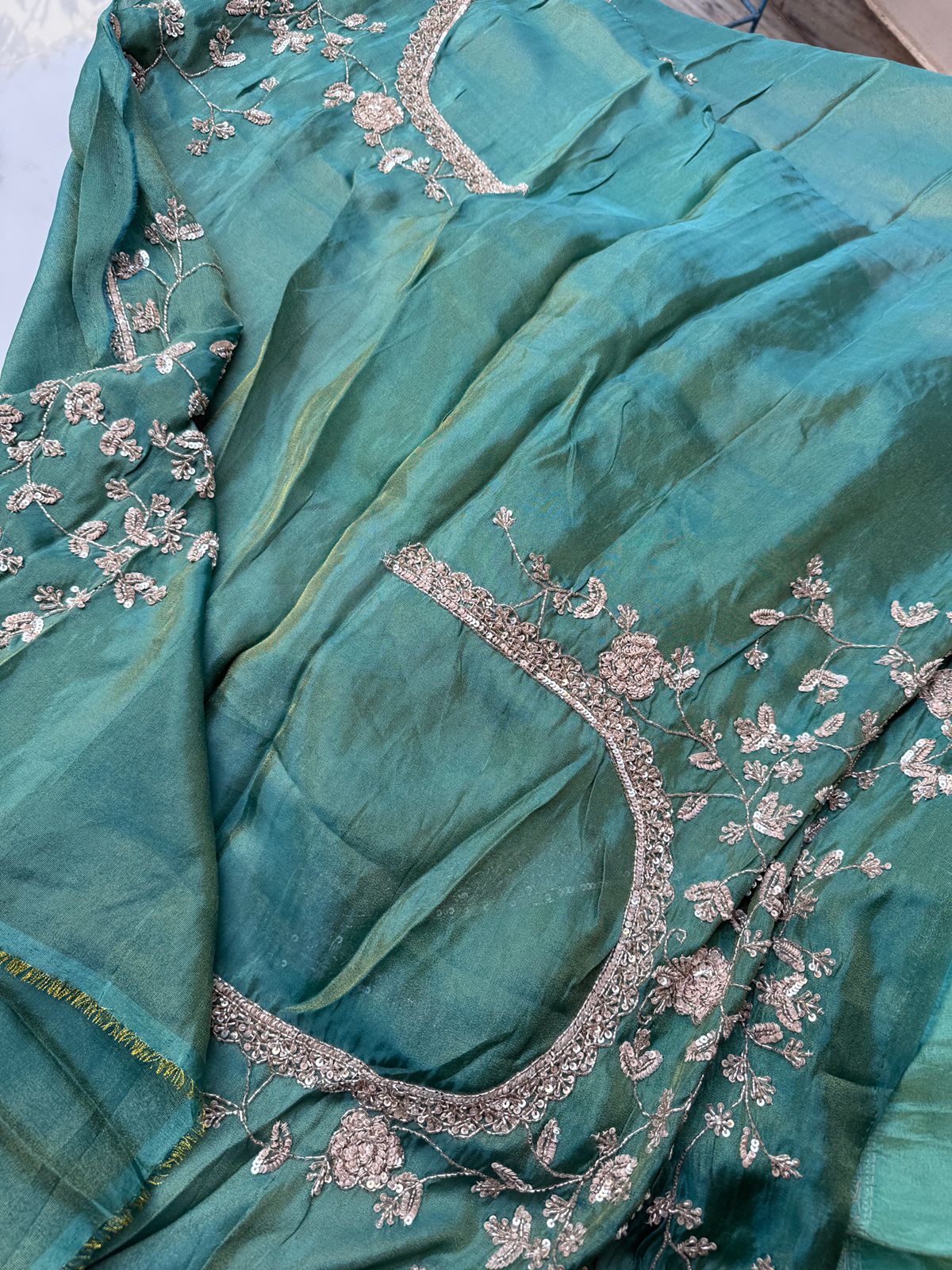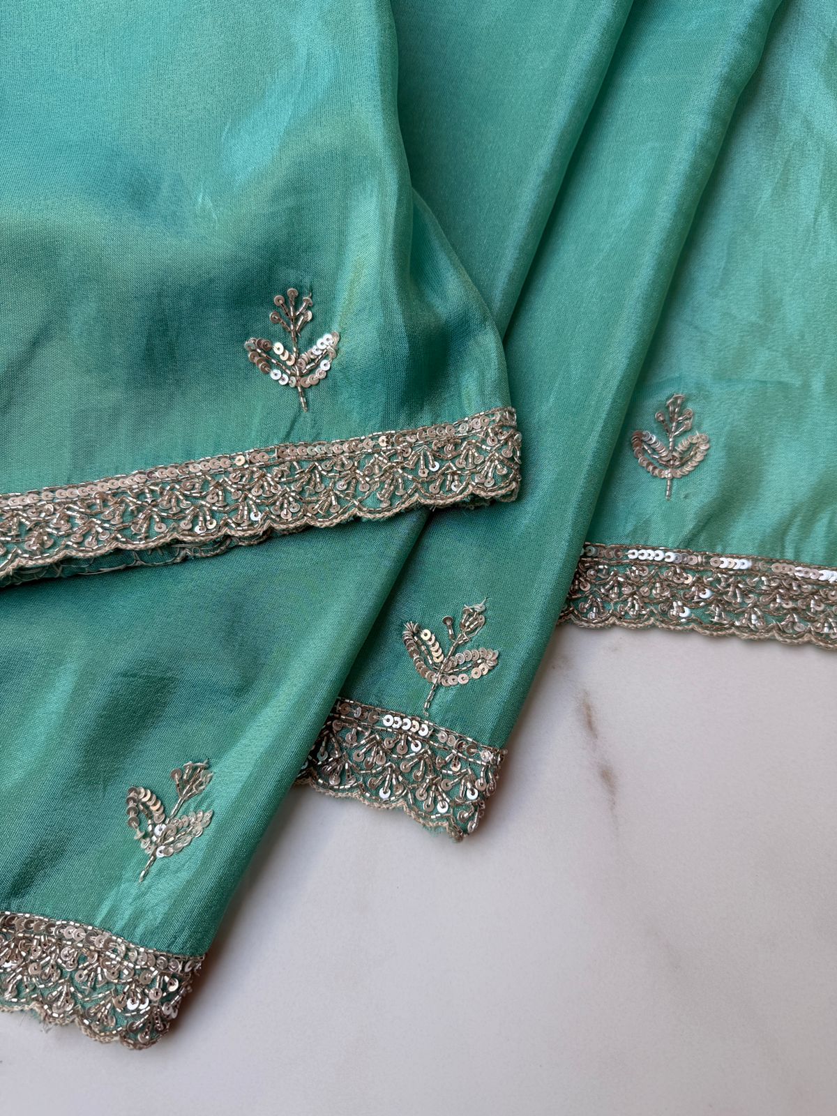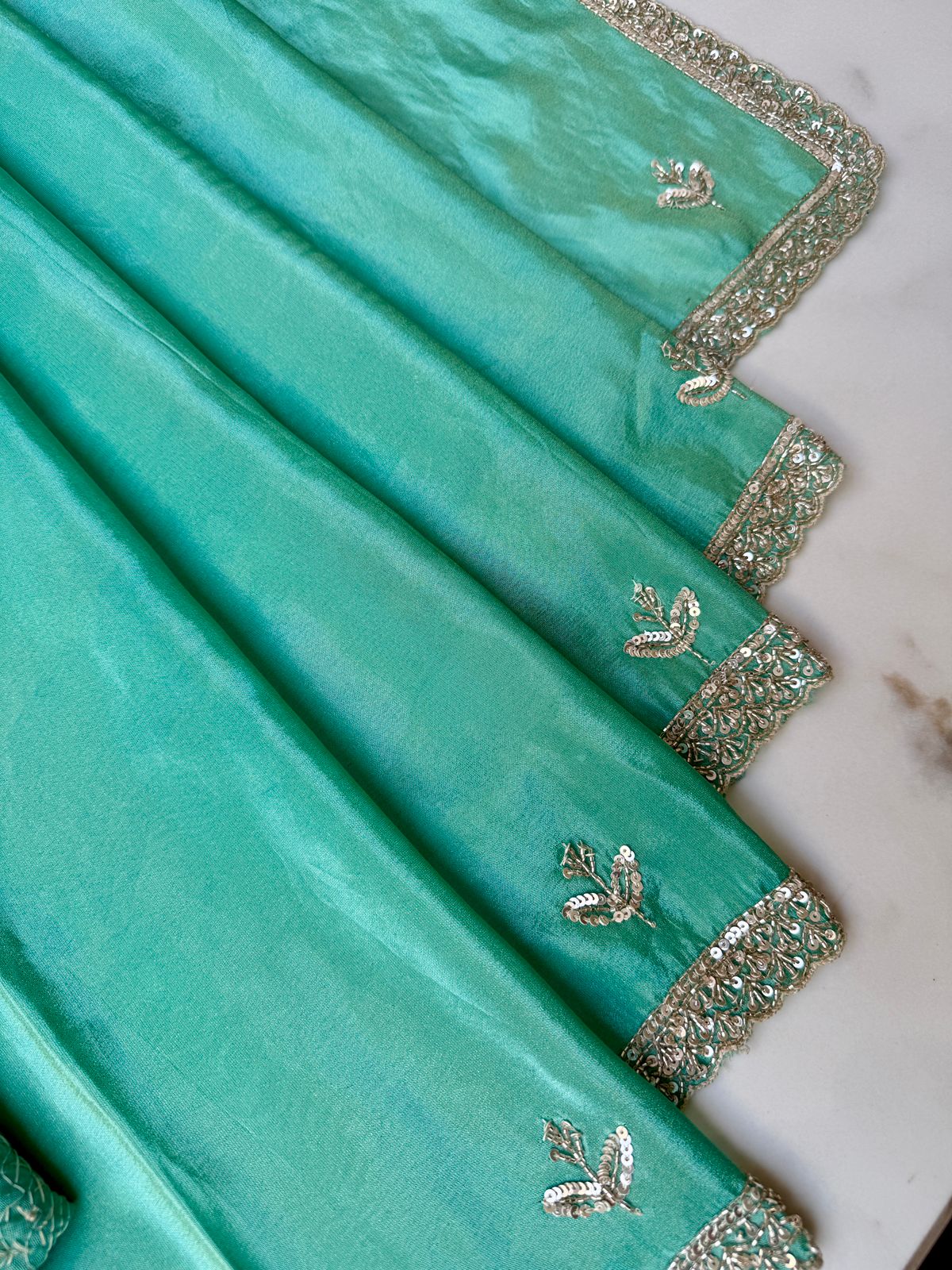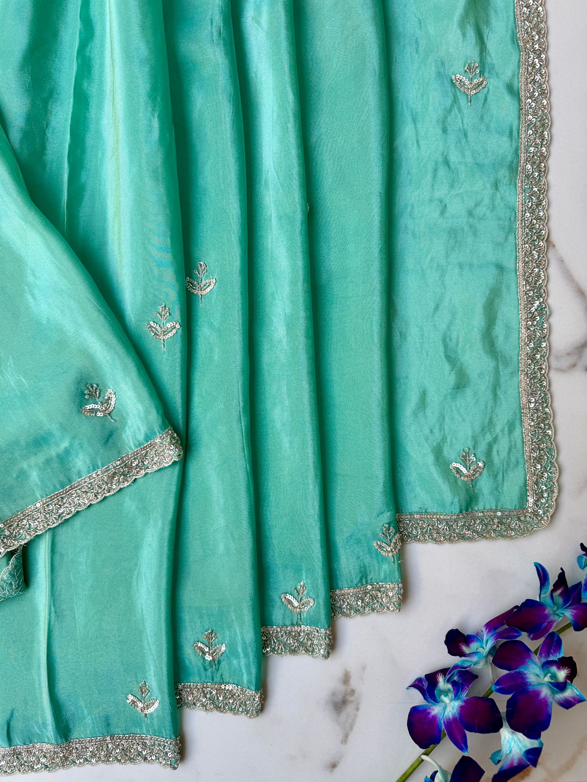 Graceful, refreshing, and exquisitely handcrafted—this Sea Green Tissue Georgette Saree is designed to make a luxurious statement. The tissue georgette fabric drapes softly while offering a gentle sheen, creating a perfect blend of comfort and grandeur.