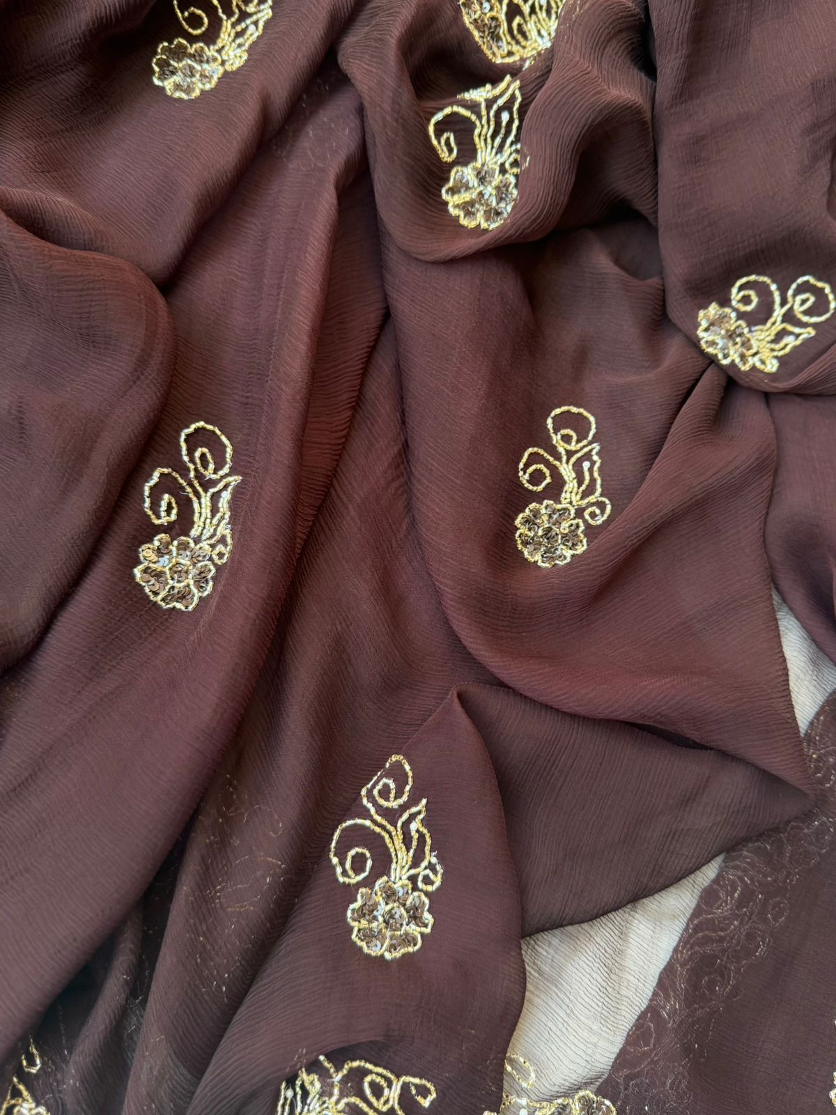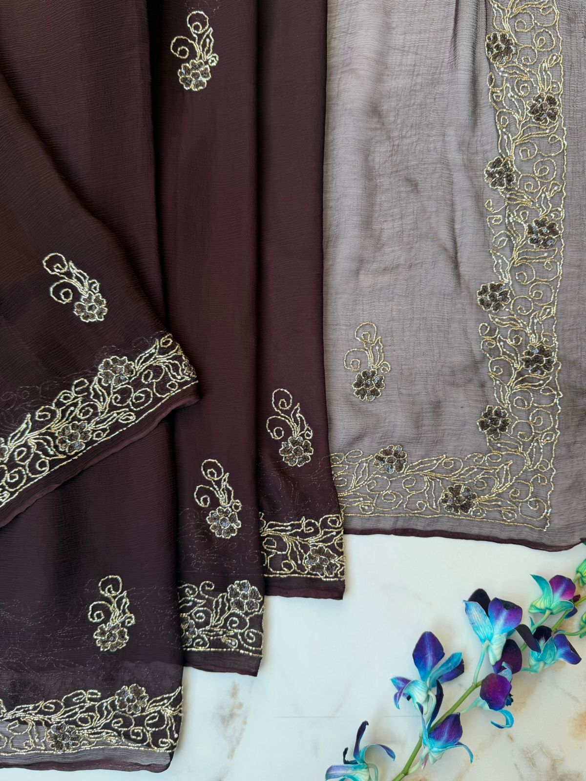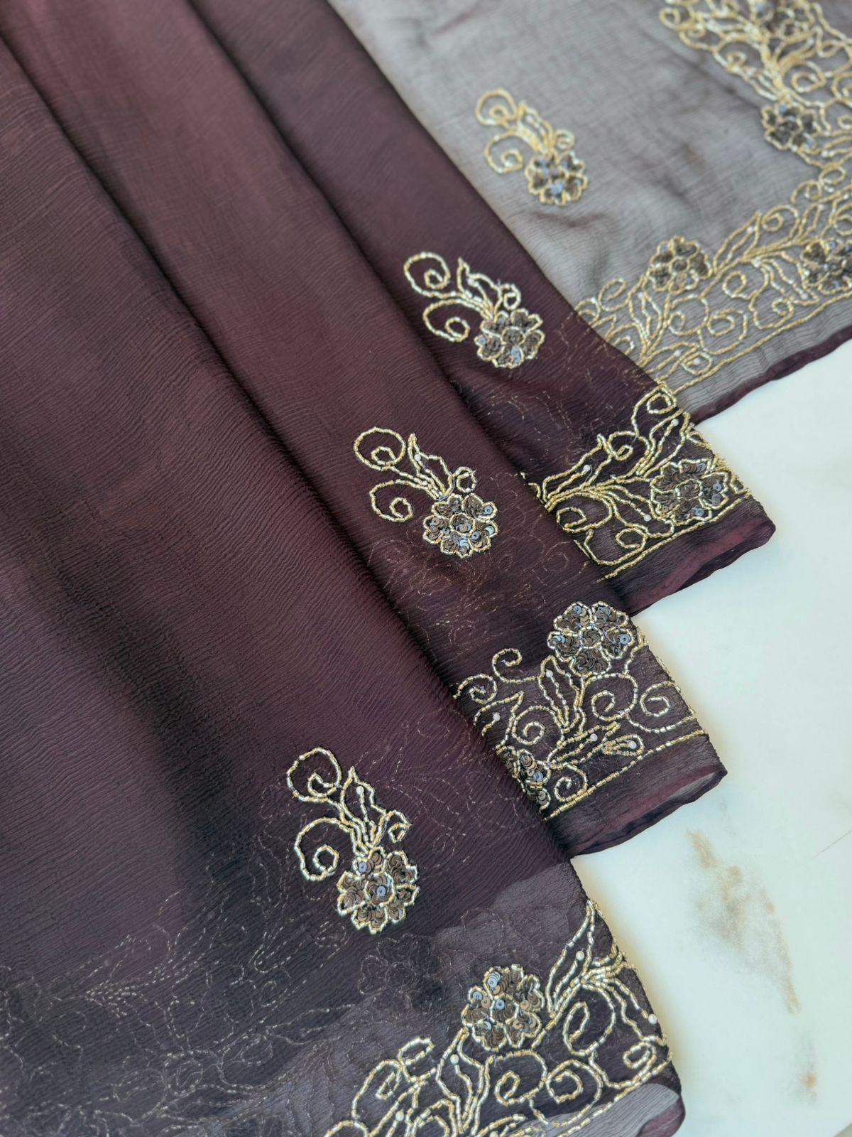 Wine color Chiffon Saree with Cut-dana and Sequence Embroidery – Khiamalssarees