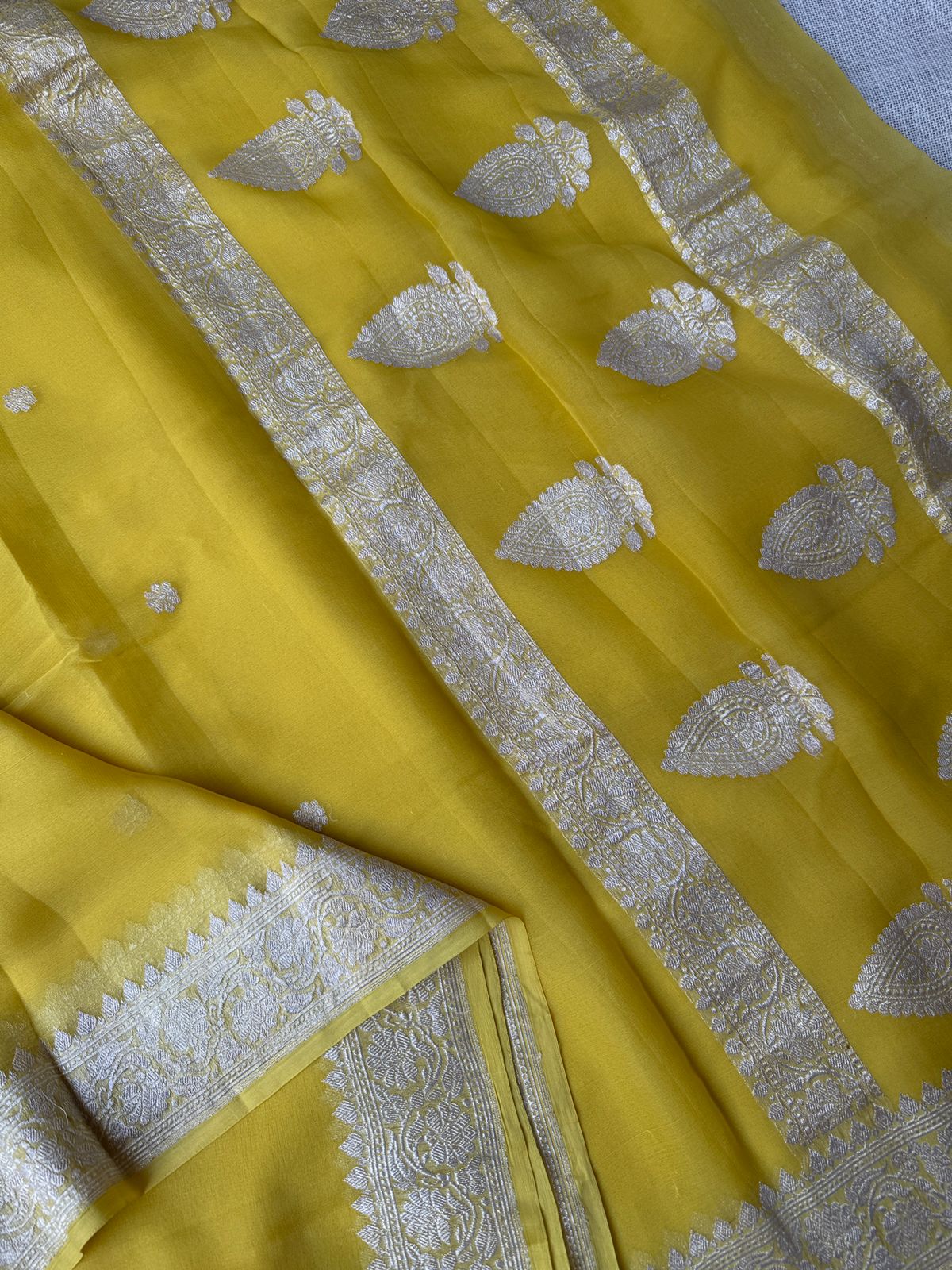 Yellow color Pure Khaddi Hand woven Benarasi Georgette Saree with zari weaving
