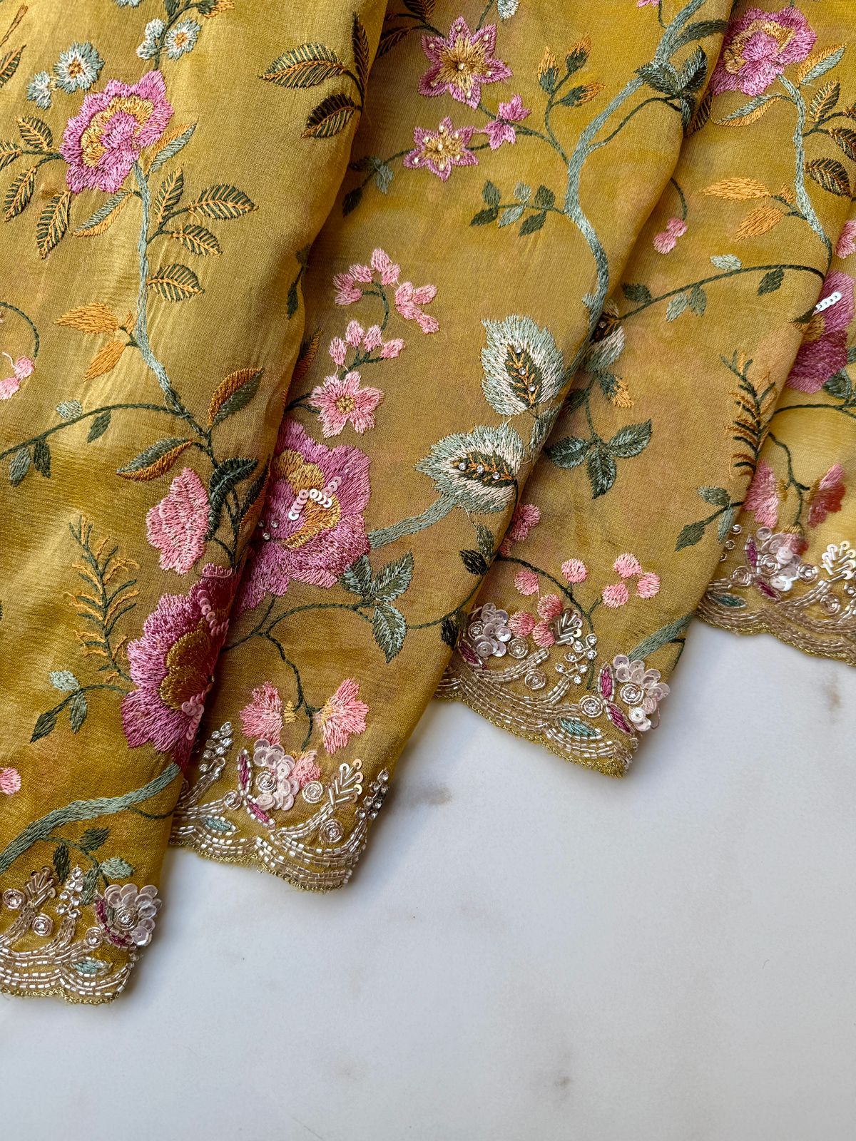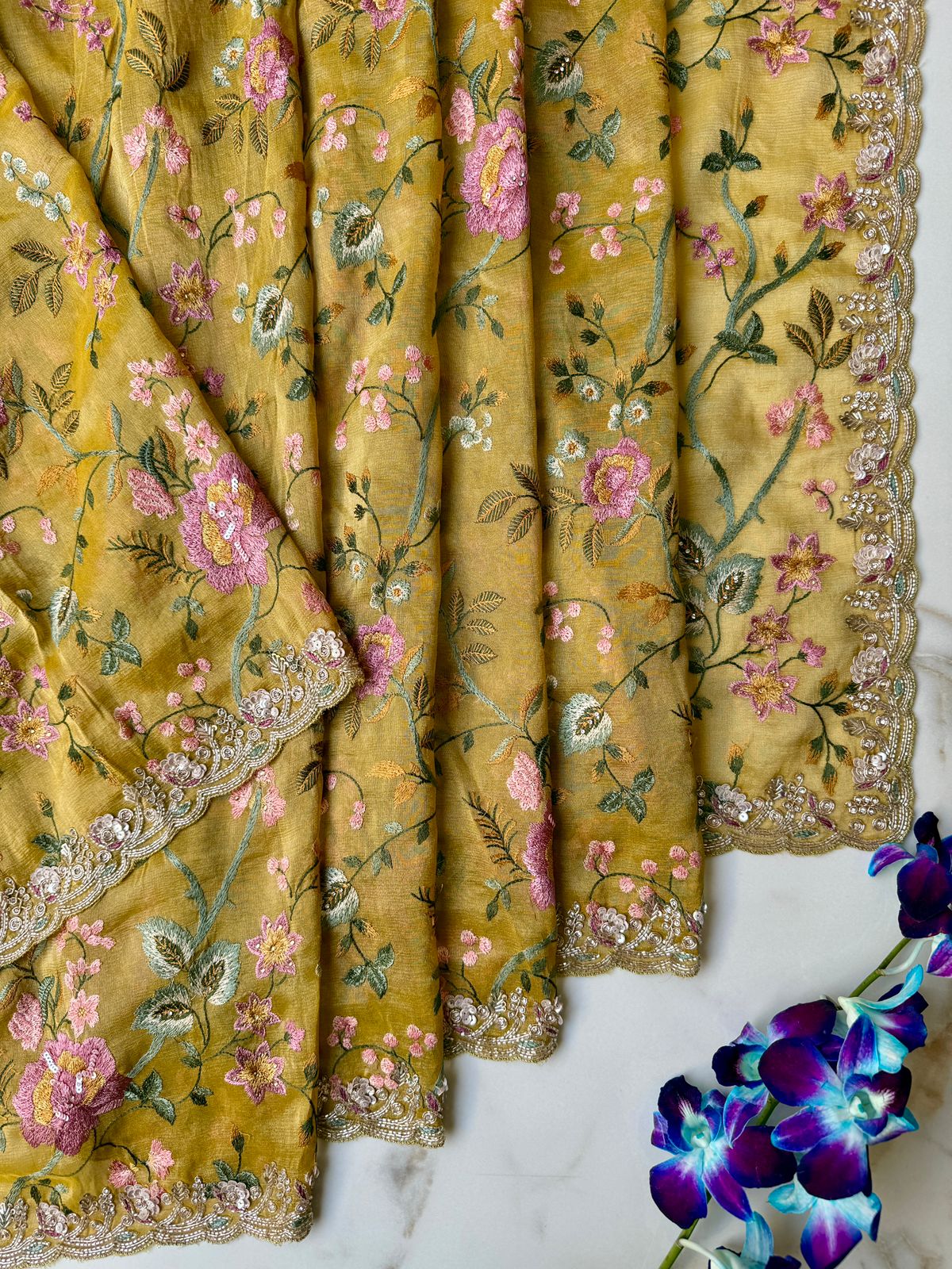Bright, graceful, and intricately handcrafted — this Yellow Organza Tissue Saree is a stunning blend of delicacy and luxury. The lightweight organza tissue fabric drapes like a dream, offering a soft shimmer that enhances the saree’s festive appeal. Adorned with exquisite Meenakari detailing, sparkling sequence work, refined Nalki hand embroidery, and regal Kundan embellishments, this saree is designed to make a statement at every celebration