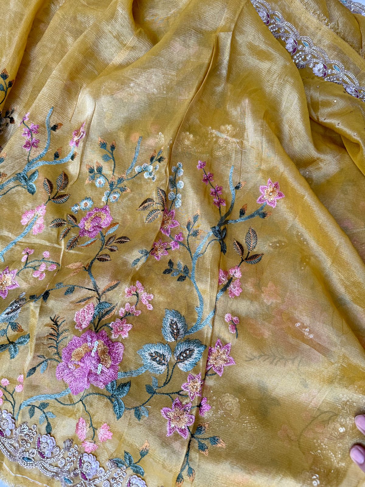 Yellow Organza Tissue Saree with Meenakari, Sequence, Nalki & Kundan Embroidery